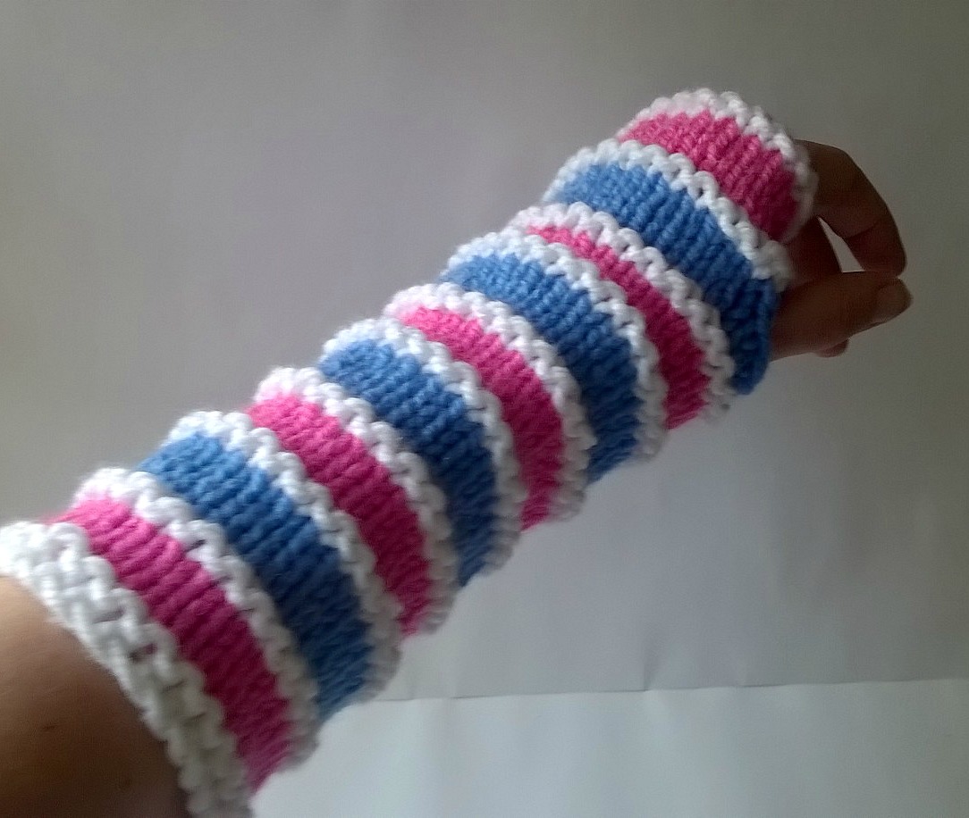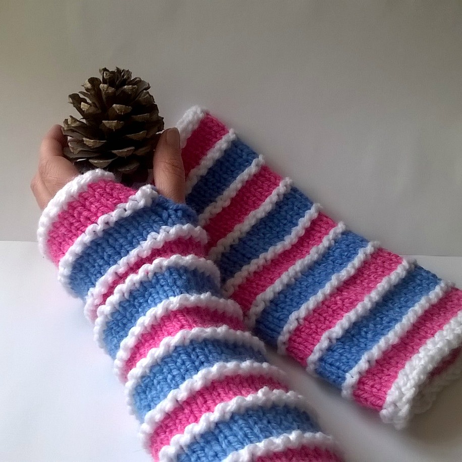 Ručně pletené návleky na ruce s otvorem na palec ze silné příze. Materiál 100% akryl, barva růžévá, střední modrá a bílá.