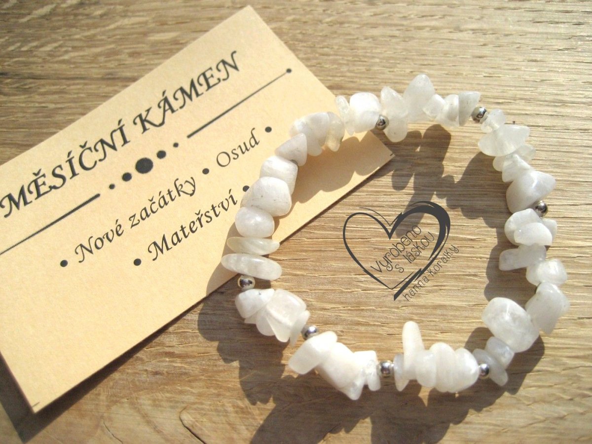 Pružný, jednoduchý, sekaný náramek na silikonové gumičce z minerálu měsíční kámen, doplněný stříbrnými korálky v patině,délka 18 - 18,5cm, cena za kus
