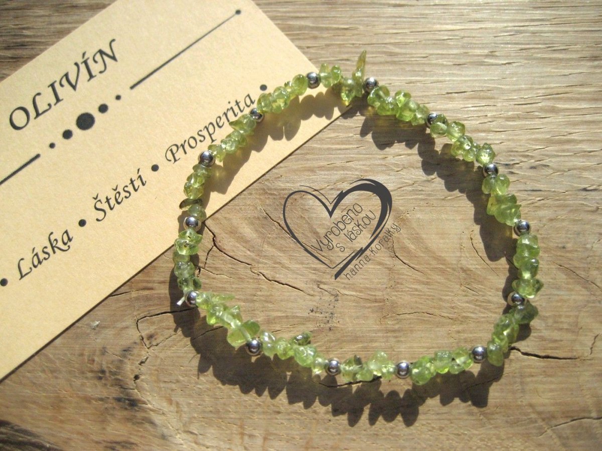 Pružný, jednoduchý, sekaný náramek na silikonové gumičce z minerálu olivín, doplněný stříbrnými korálky v patině,délka 18 - 18,5cm, cena za kus