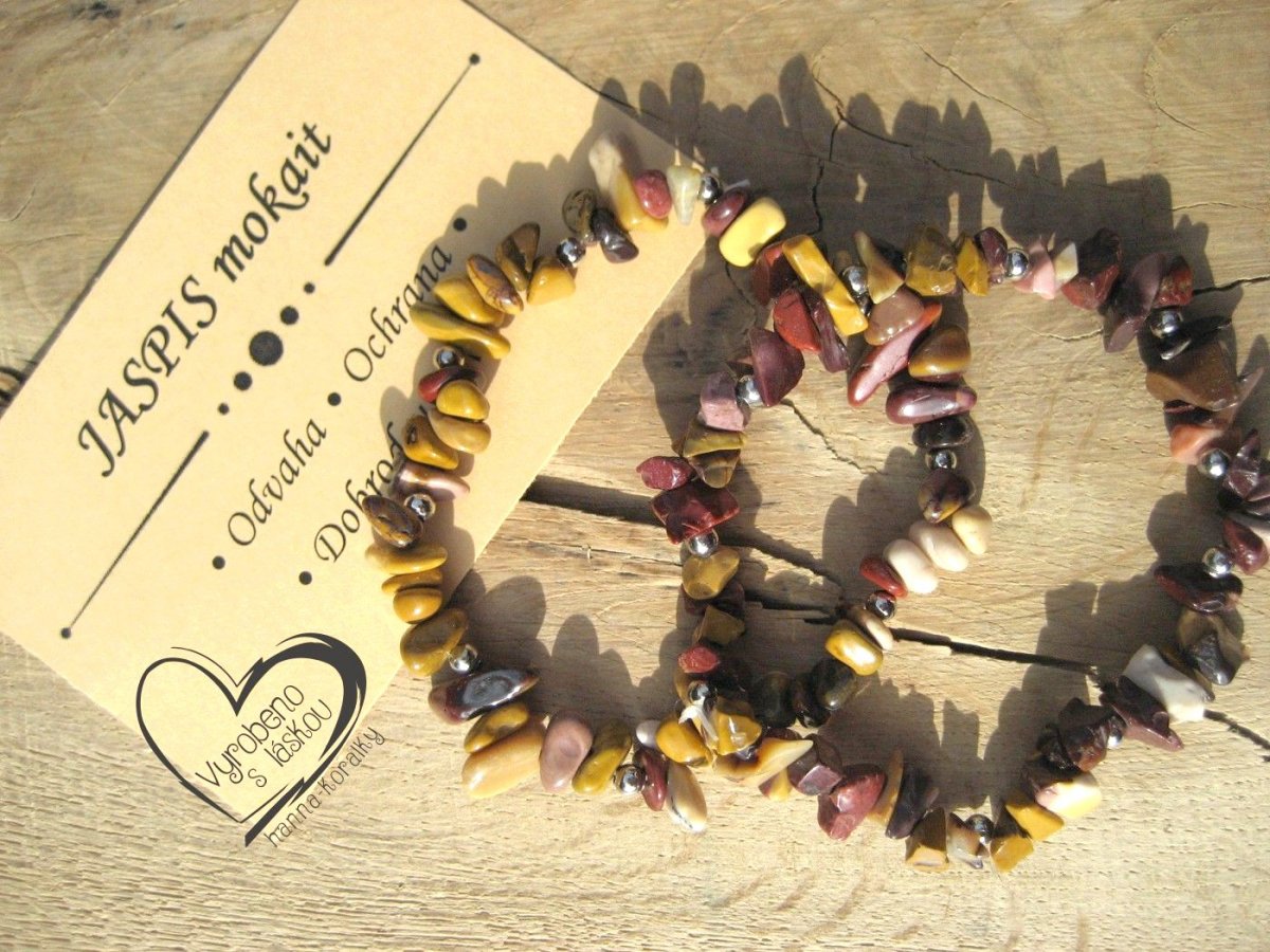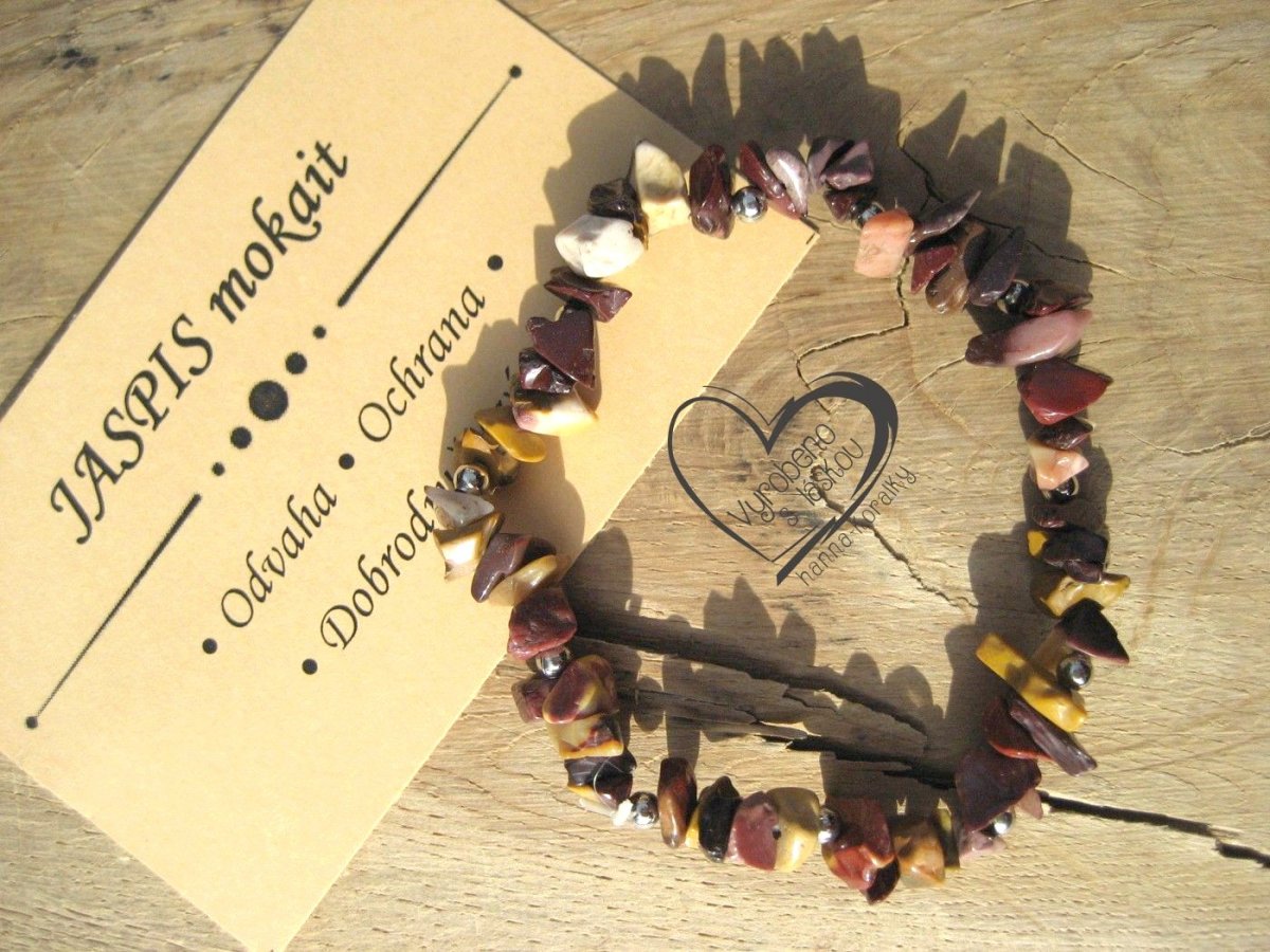 Pružný, jednoduchý, sekaný náramek na silikonové gumičce z minerálu jaspis mokait, doplněný stříbrnými korálky v patině,délka 18 - 18,5cm, cena za kus