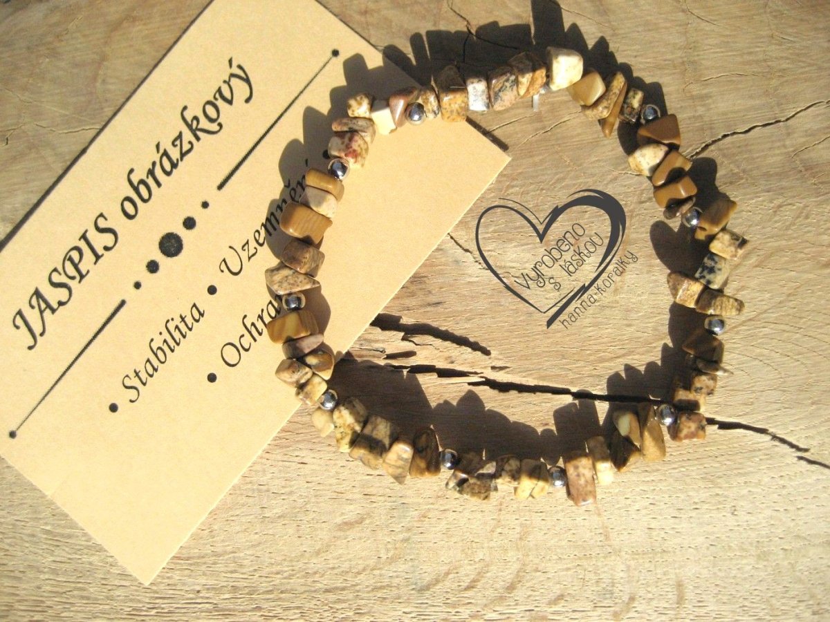 Pružný, jednoduchý, sekaný náramek na silikonové gumičce z minerálu jaspis obrázkový, doplněný stříbrnými korálky v patině,délka 18 - 18,5cm