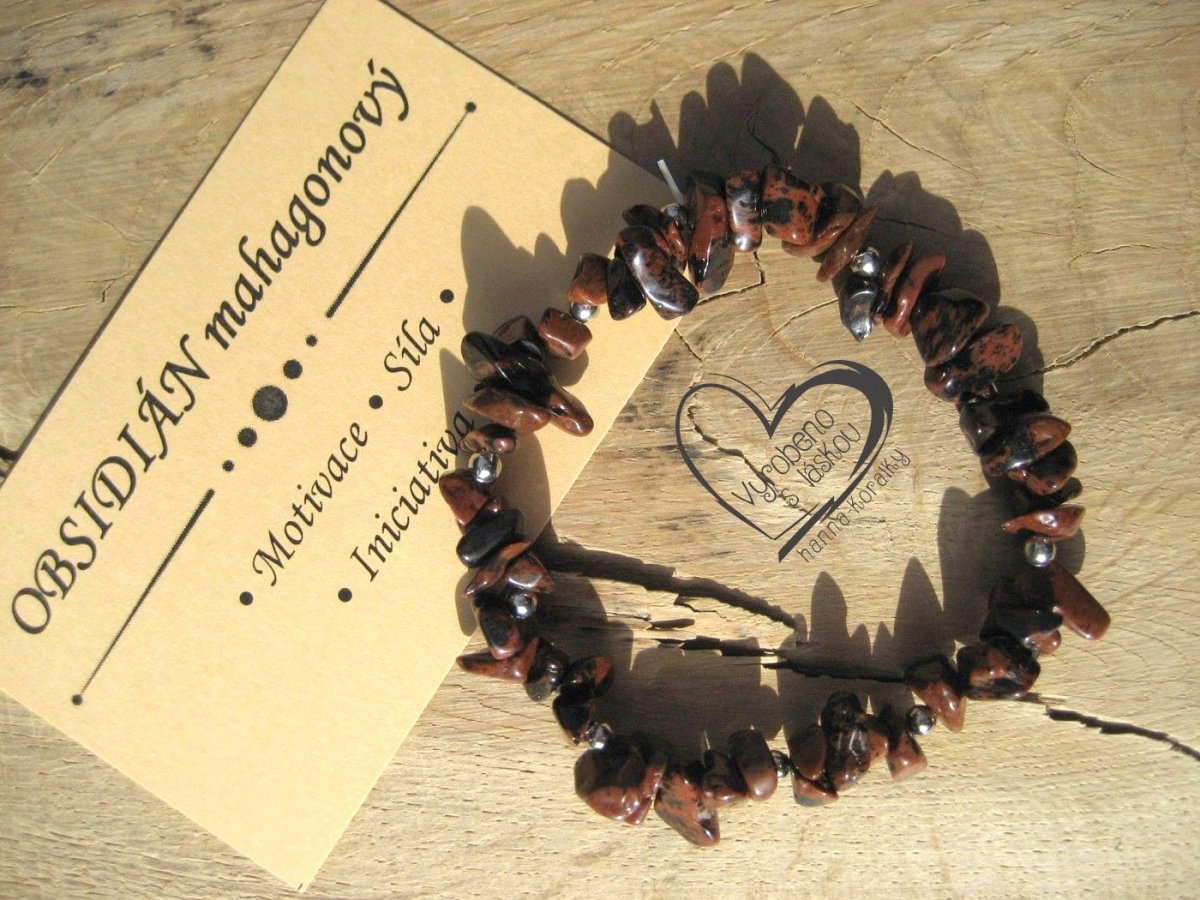 Pružný, jednoduchý, sekaný náramek na silikonové gumičce z minerálu obsidián mahagon, doplněný stříbrnými korálky v patině,délka 18 - 18,5cm