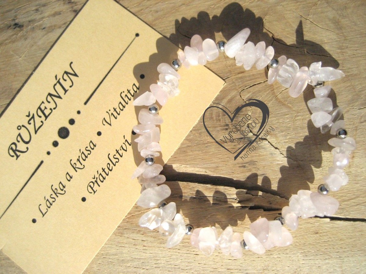 Pružný, jednoduchý, sekaný náramek na silikonové gumičce z minerálu růženín, doplněný stříbrnými korálky v patině,délka 18 - 18,5cm