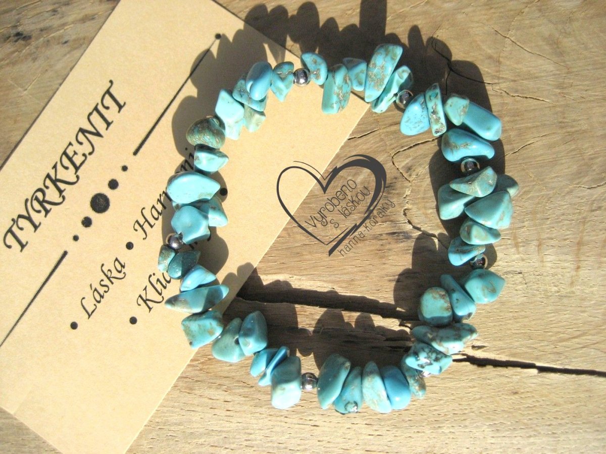 Pružný, jednoduchý, sekaný náramek na silikonové gumičce z minerálu tyrkenit, doplněný stříbrnými korálky v patině,délka 18 - 18,5cm