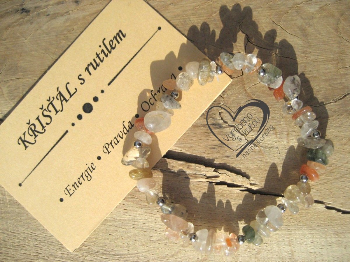 Pružný, jednoduchý, sekaný náramek na silikonové gumičce z minerálu křišťál s rutilem - sagenit, doplněný stříbrnými korálky v patině,délka 18 - 18,5cm, cena za 1 kus