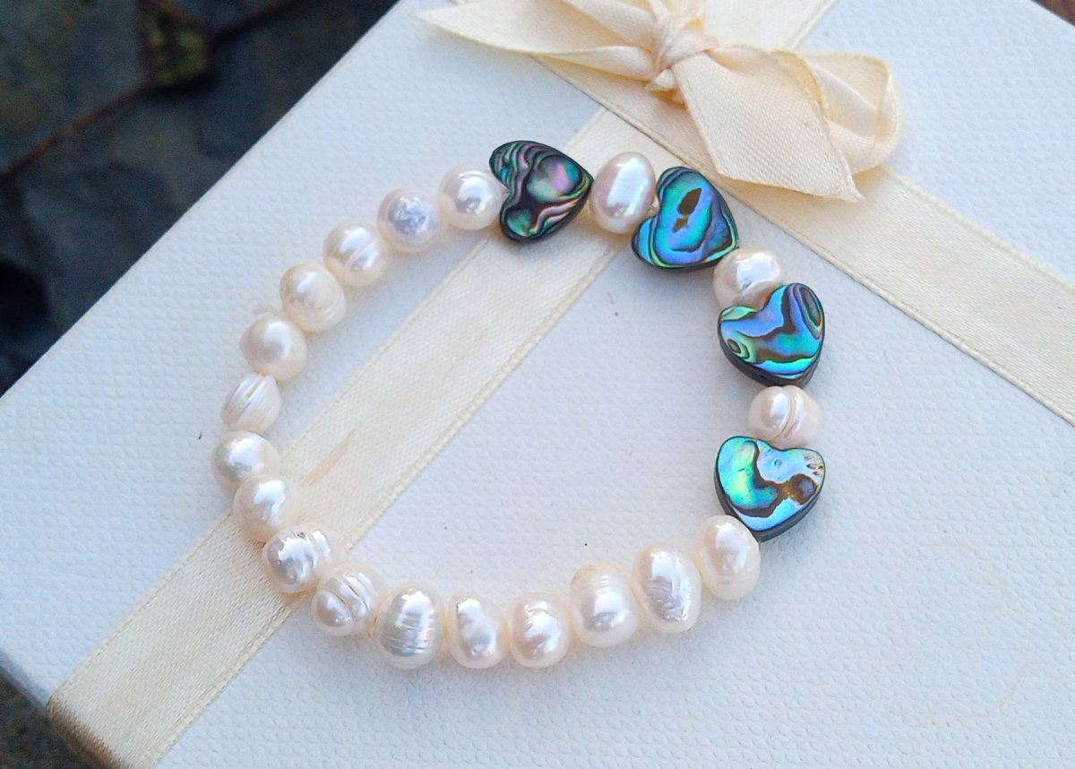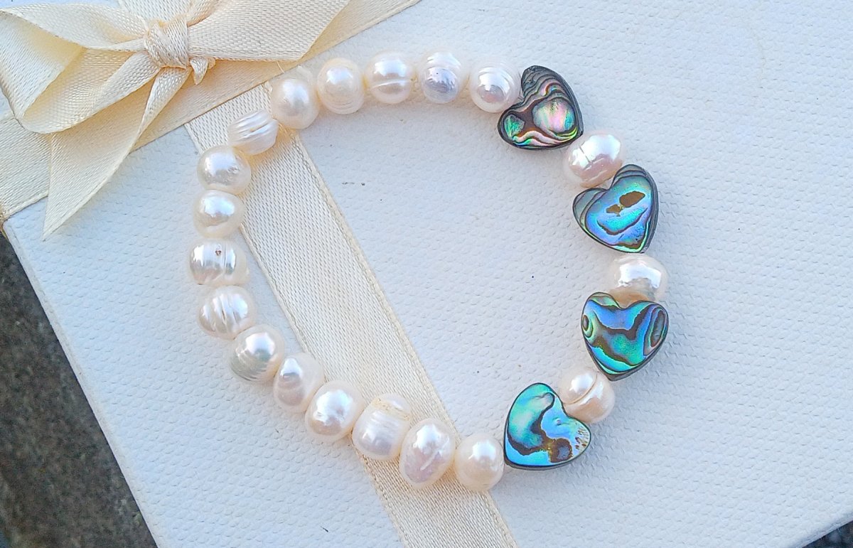 Jedinečný pružný náramek z říčních perel v kombinaci se srdíčky z Novozélandské Paua abalone perleti je okouzlujícím doplňkem, který v sobě snoubí nadčasovou eleganci a přírodní krásu. Tento šperk, často nazývaný "mořský opál", je ideální pro každodenní nošení i speciální příležitosti.