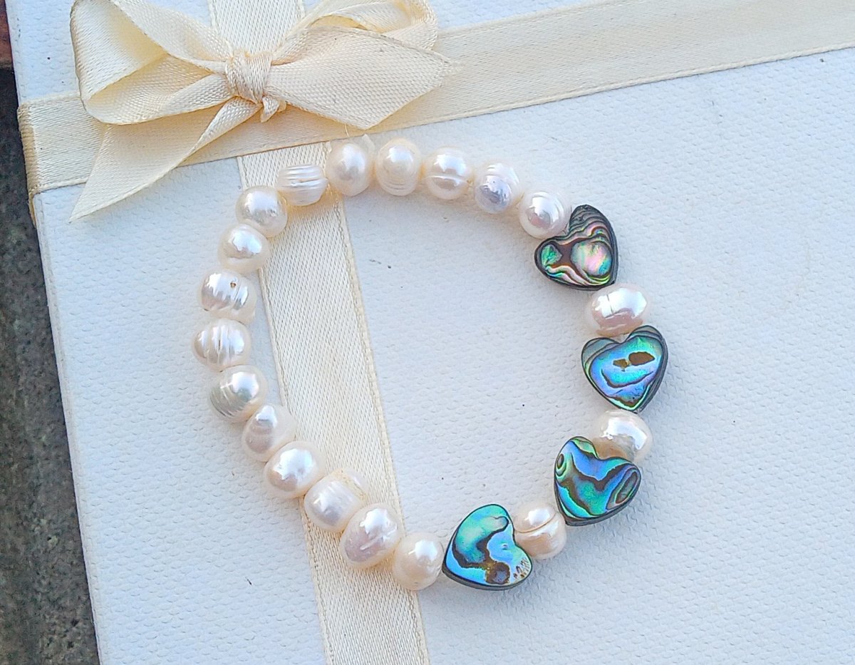 - Design a rozměry: Náramek kombinuje perly a srdíčka, přičemž perleťová srdíčka mají rozměry přibližně 12x12 mm a perly mají průměr přibližně 8 mm. Perly vynikají přirozeným leskem s perleťovými odlesky a srdíčka hrají duhovými barvami od fialové po tyrkysovou.