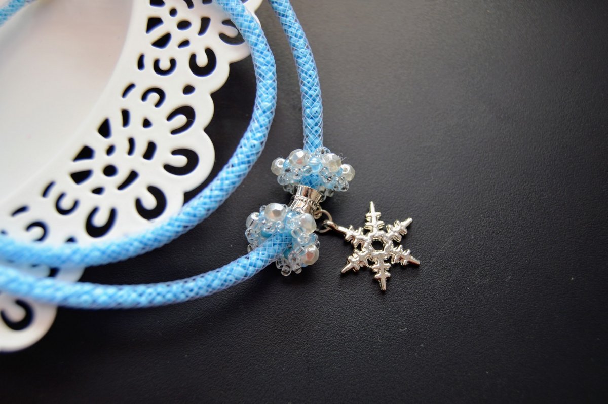 Náhrdelník lze nosit i jako náramek. Dutinka je plněná modrými korálky a na dutince jsou navlečeny korálky s velkým průvlekem vlastní tvorby a mezi nimi přívěšek vločky.