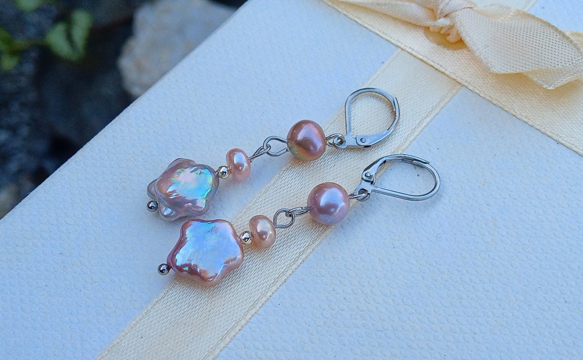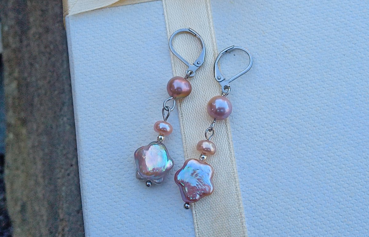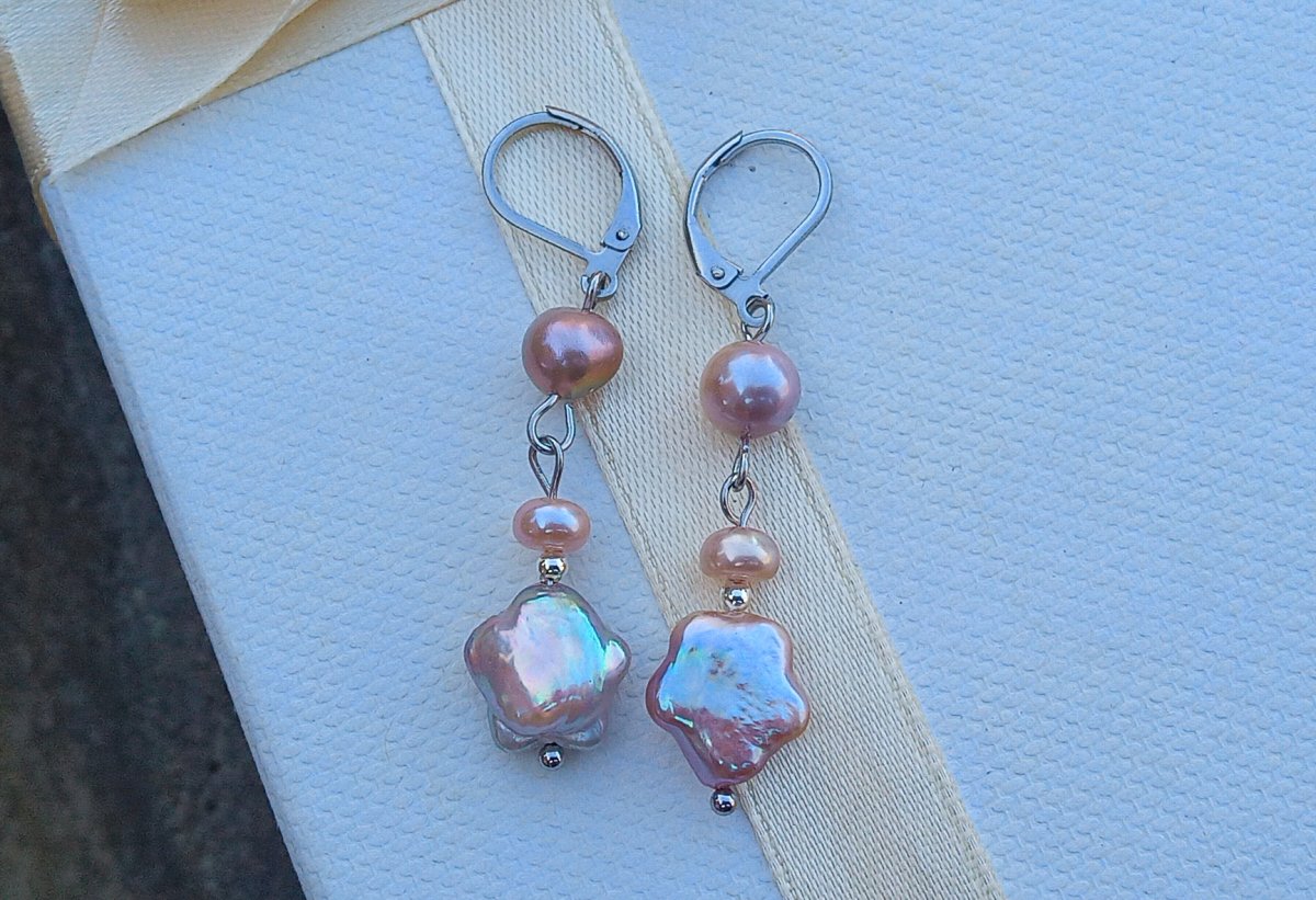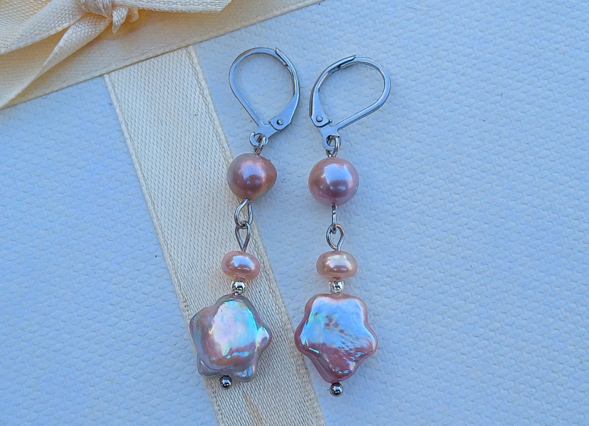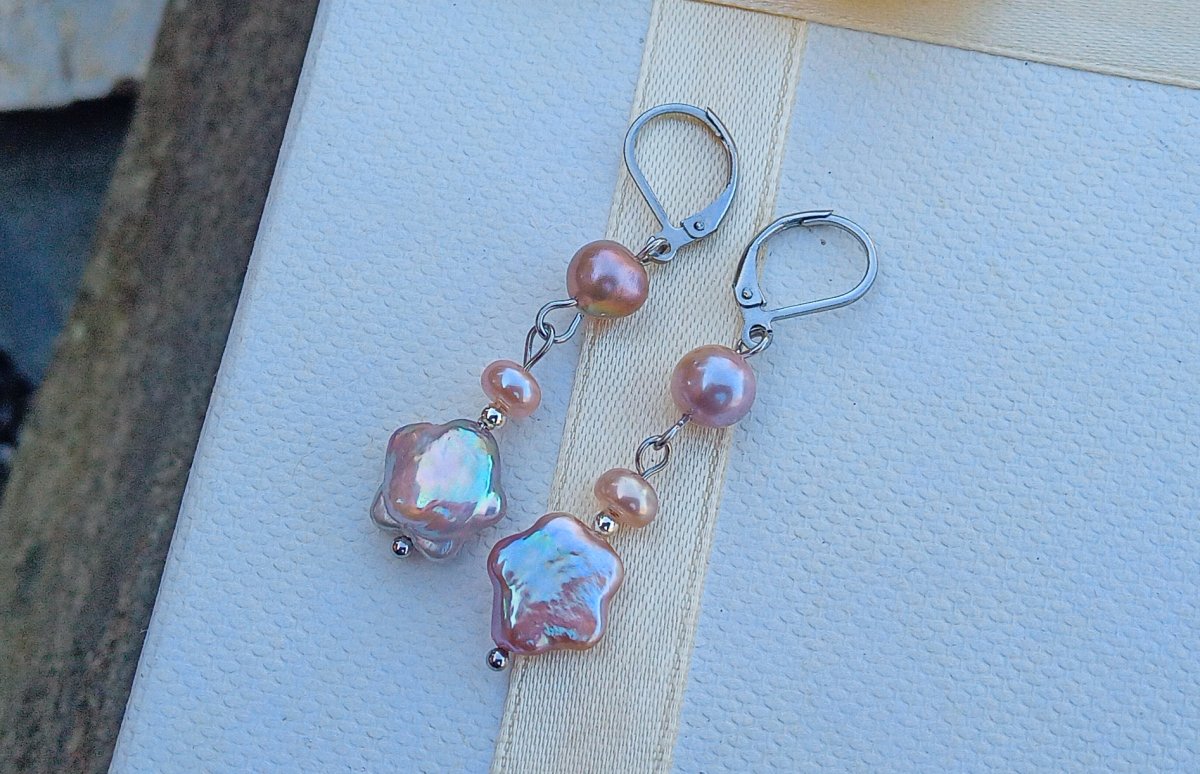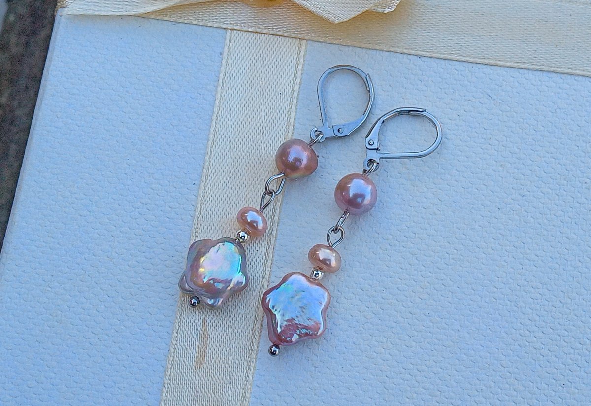 Nádherně perleťově duhové dokonale lesklé fialkové prvotřídnímořsképerly ve tvaru hvězdiček o průměru 12 mm zavěšené pod perlami 5 a 8 mm na zavíracích háčcích z chirurgické oceli - vhodné i pro alergiky. Celková délka náušnic 5 cm.