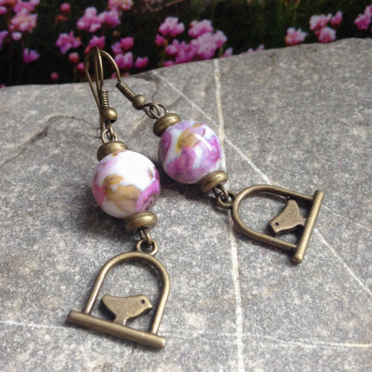 Náušnice ve starobylém stylu - vintage v barvě mosazi s bílou plastovou kuličkou s růžičkami a přívěskem ptáčka v klícce. Mosazný háček, gumové zarážky. Délka od háčku cca 3,5 cm