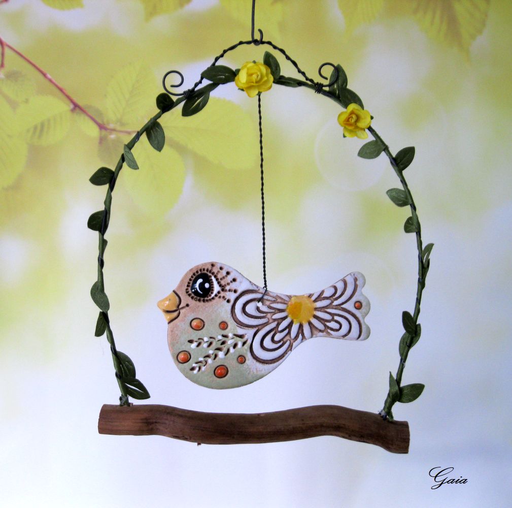 Drátovaná jarní dekorace s nazdobeným keramickým ptáčkem.