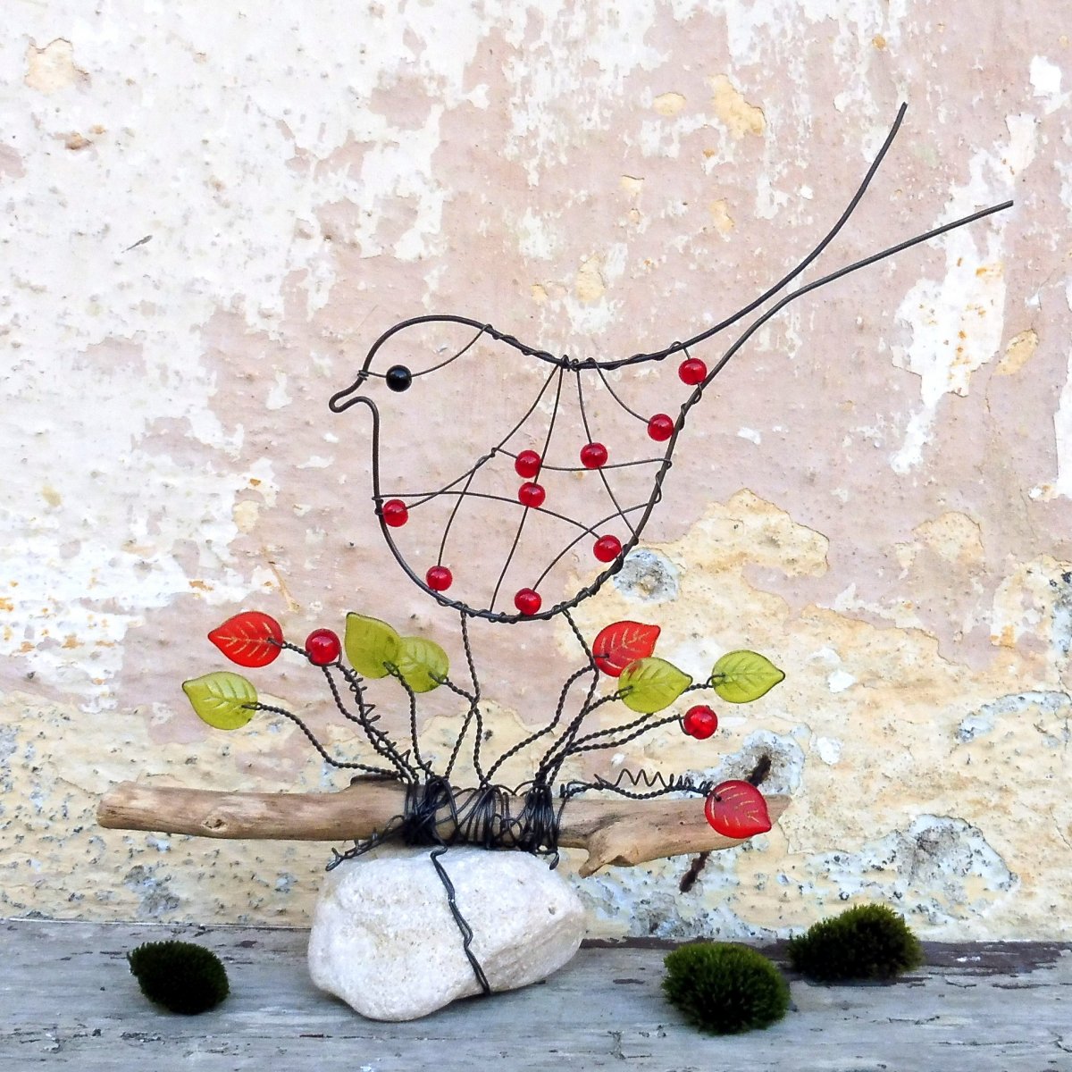 Na říčním kameni - větvička, drátovaný ptáček, skleněné zelené a červené lístečky, červené korálky.
