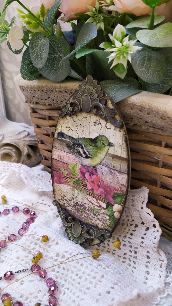 Závěsná dekorace na stěnu s motivem ptáčka na větvičce s růžovými kvítky. Na spodní i horní části dekorace je patinovaná bordura. Obrázek je opatřen matným lakem. Zavěšení je na kovový závěs.
