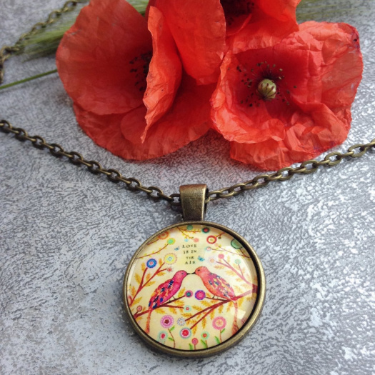 Mosazný přívěsek (běžný kov) se skleněným kabošonem s barevným motivem - viz foto.