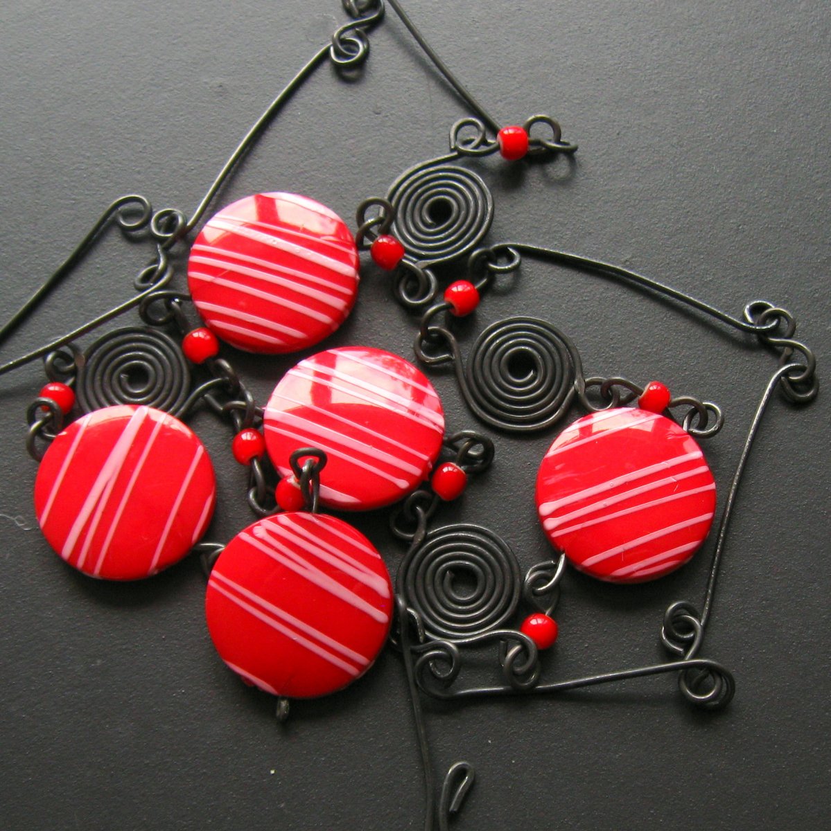 Autorský drátovaný náhrdelník z černého 1 mm drátu s červenými plastovými placatými korálky s bílými proužky. Velikost korálků je cca 2,2 cm.