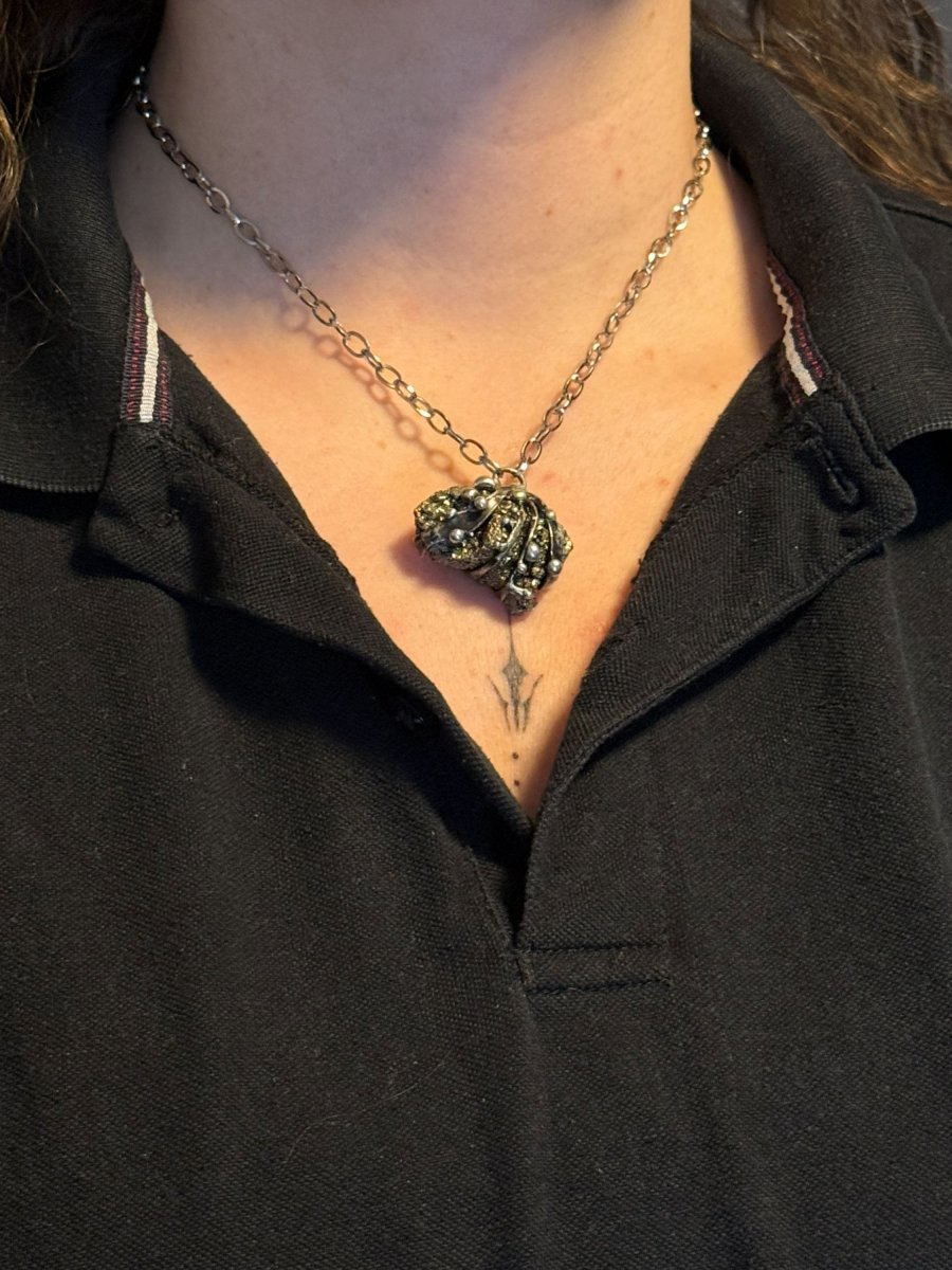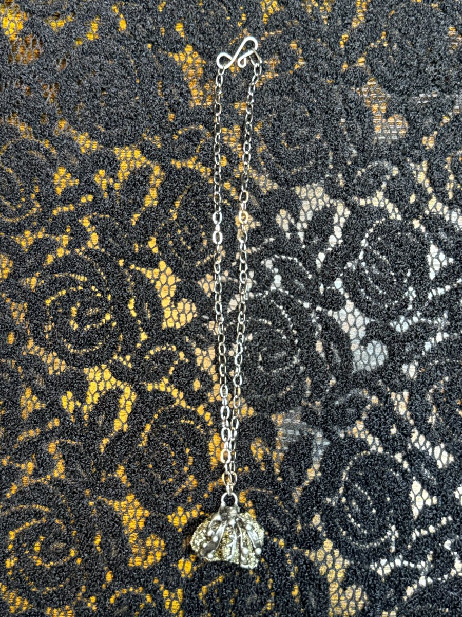 Minerál je opracovaný bezolovnatým cínem, se spoustou detailů a cínových kuliček. Patinováno černou patinou a vybroušeno kovovou vatou. Celý šperk ošetřen antioxidačním olejem a naleštěn karnaubským voskem.