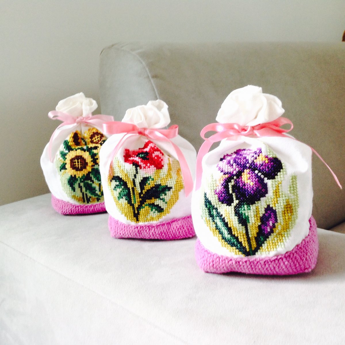 Pytlíčky jsou vyšity velmi drobnou křížkovou výšivkou na perličce a všity do háčkovaných čtyřhranných košíčků, jsou uháčkovány z příze Poly. Zdobené hedvábnou stužkou. Celé jsou šité a obšívané ručně. Výrobek prát v jemném pracím prosředku na barevné prádlo. Žehlit po rubu. Jedná se o orginální autorský výrobek. Pouze jeden kus.Roz.10x10x15cm Jsou i jiné variace. Cena za 1 kus. Upozornění: při výrobě nepoužívám šicího stroje mé výrobky jsou precizně vypracovány.