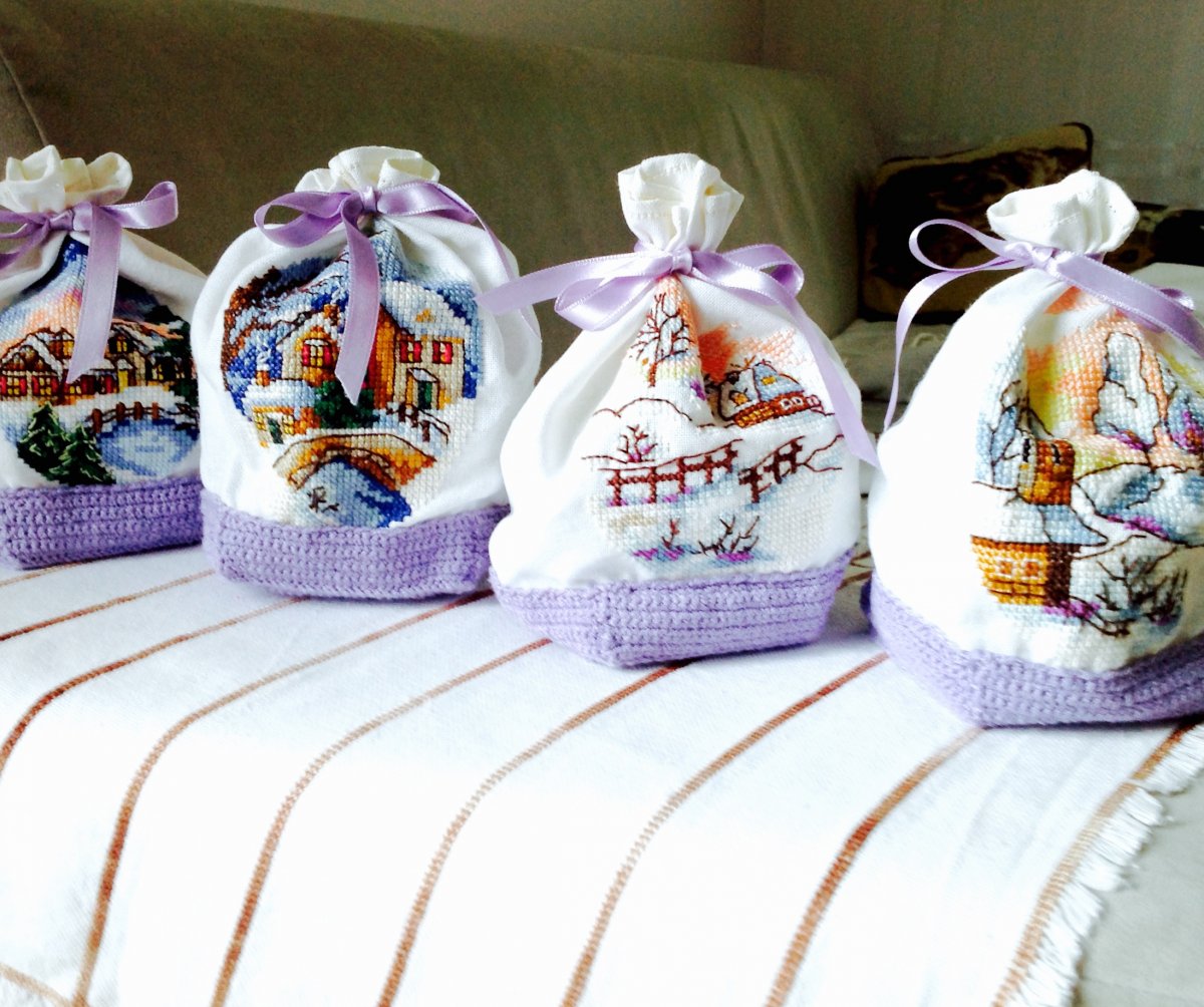 Pytlíčky jsou vyšity velmi drobnou křížkovou výšivkou na perličce a všity do háčkovaných čtyřhranných košíčků, jsou uháčkovány z příze Poly. Zdobené hedvábnou stužkou. Celé jsou šité a obšívané ručně. Výrobek prát v jemném pracím prosředku na barevné prádlo. Žehlit po rubu. Jedná se o orginální autorský výrobek. Pouze jeden kus.Roz.10x10x15cm Jsou i jiné variace. Cena za 1 kus. Upozornění: při výrobě nepoužívám šicího stroje mé výrobky jsou precizně vypracovány.