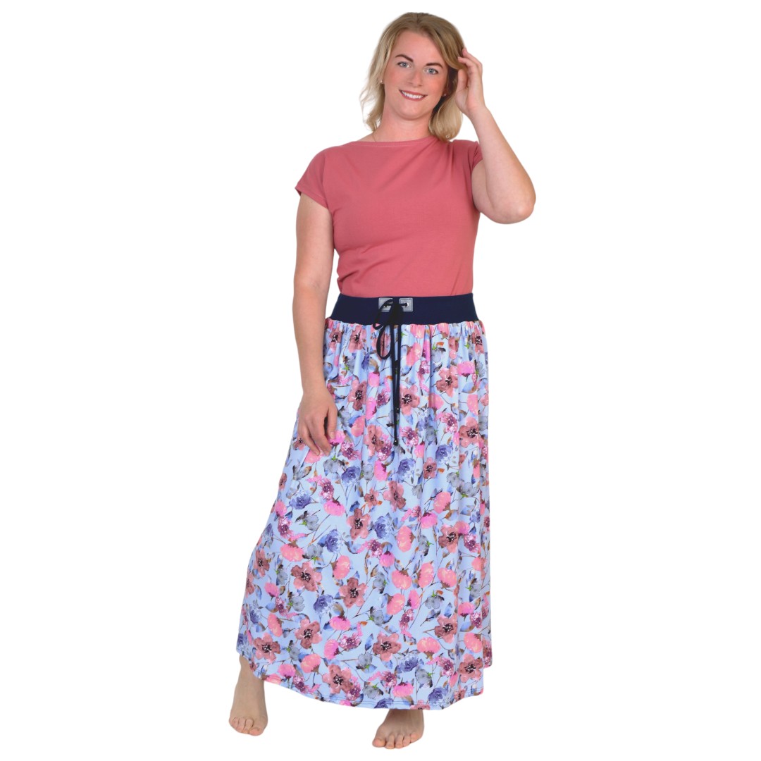 Tato sukně je řasená a všitá do modrého, bavlněného nápletu, který je provlečen šňůrkou. Díky této kombinaci je pas velmi přizpůsobivý. Sukně je tedy vhodná pro pas od 70 cm až po 100 cm. Boky jsou pro max. šíři 120 cm. Délka sukně je 90 cm.