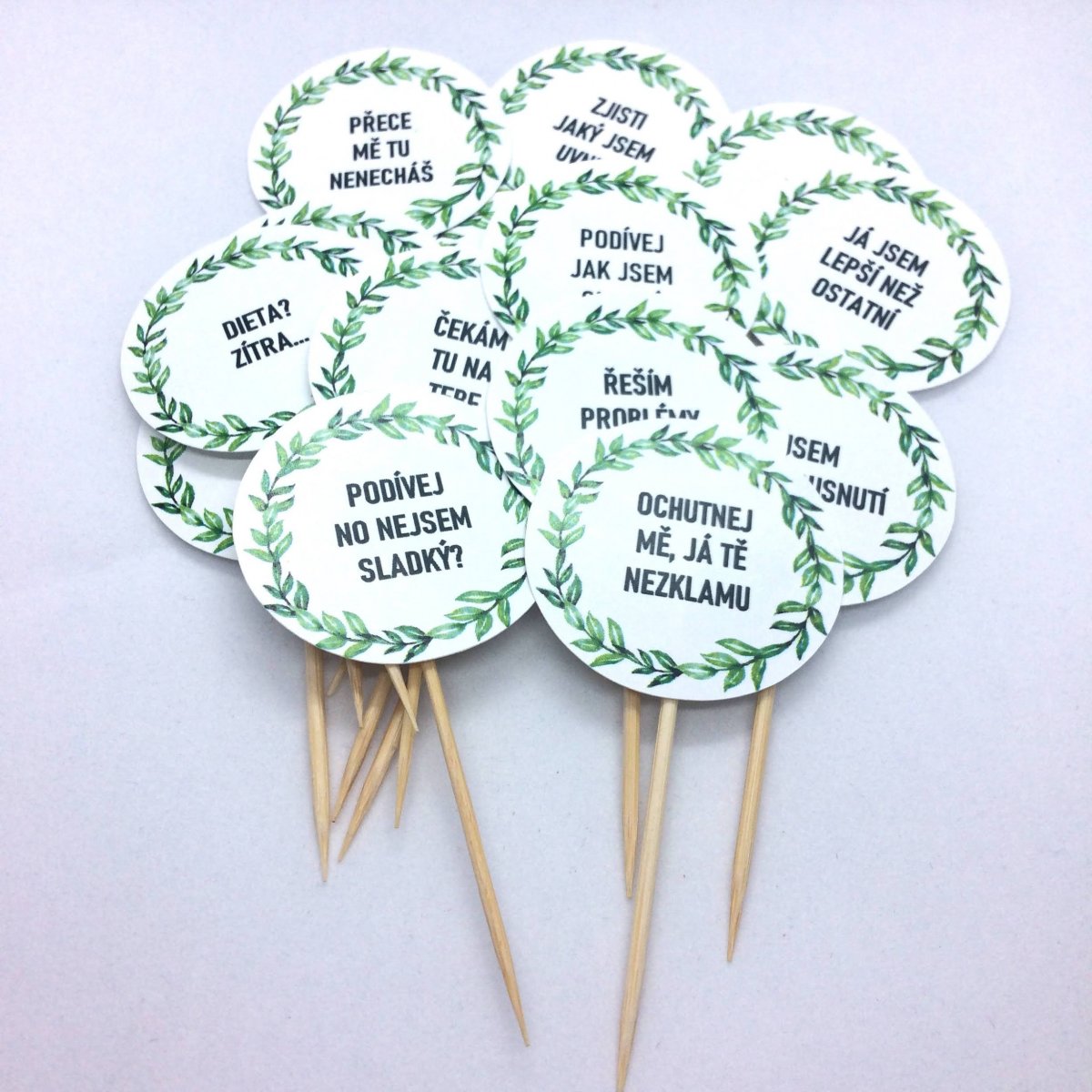 V sadě je 16 různých rautových napichovátek na jednohubky s vtipnými nápisy, které vyzývají ke konzumaci. Zápichy do dortu nebo jednohubek mají průměr 3,5 cm, celkovou výšku 7,5 cm.
