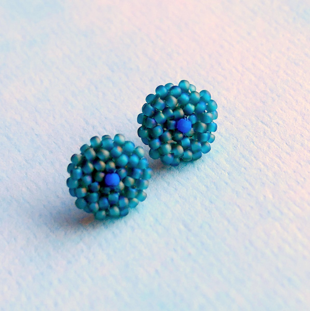 Ušito z japonského rokailu Toho barvy šedo modré, matné, šito nití nymo. Uprostřed matný modrý korálek.