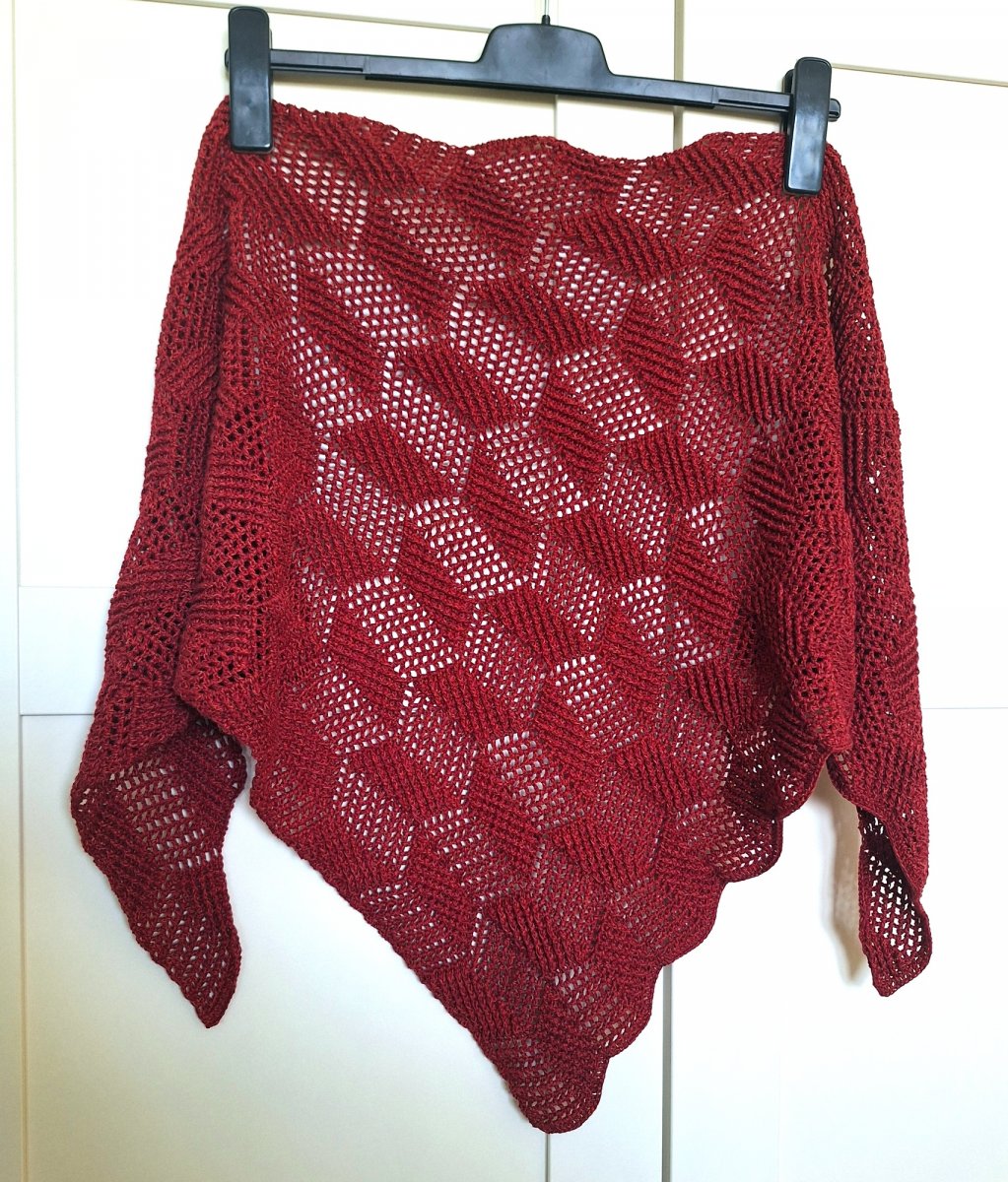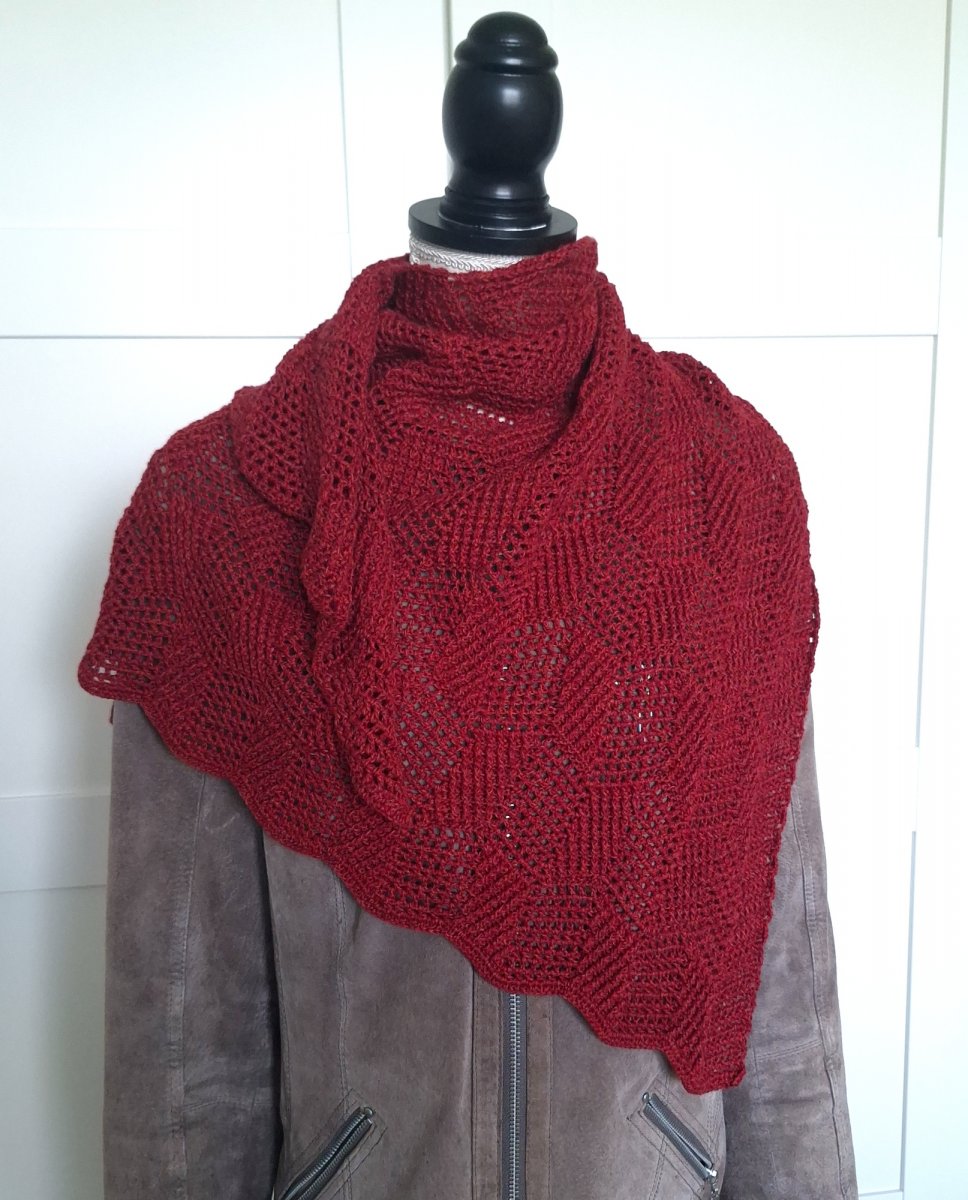 Háčkovaný šátek se zajímavým vzorkem v barvách červeného vína.