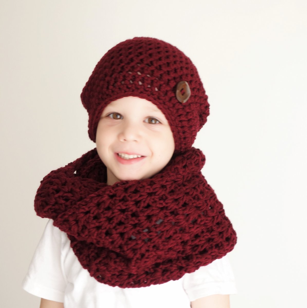 Zimný háčkovaný set vo vínovo červenej farbe.