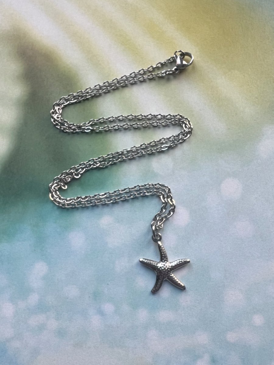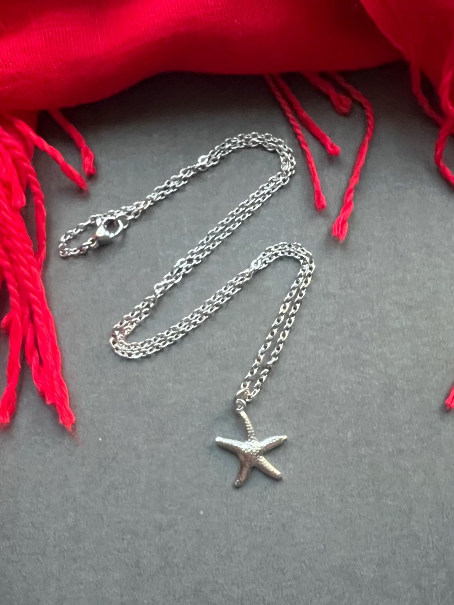 Jemný řetízek s přívěskem mořské hvězdice - cca 1,8 cm. Řetízek má délku 45 cm a na zapínání karabinku. Řetízek a veškeré kovové komponenty jsou z nerez oceli - nemění barvu a je vhodný i pro alergiky