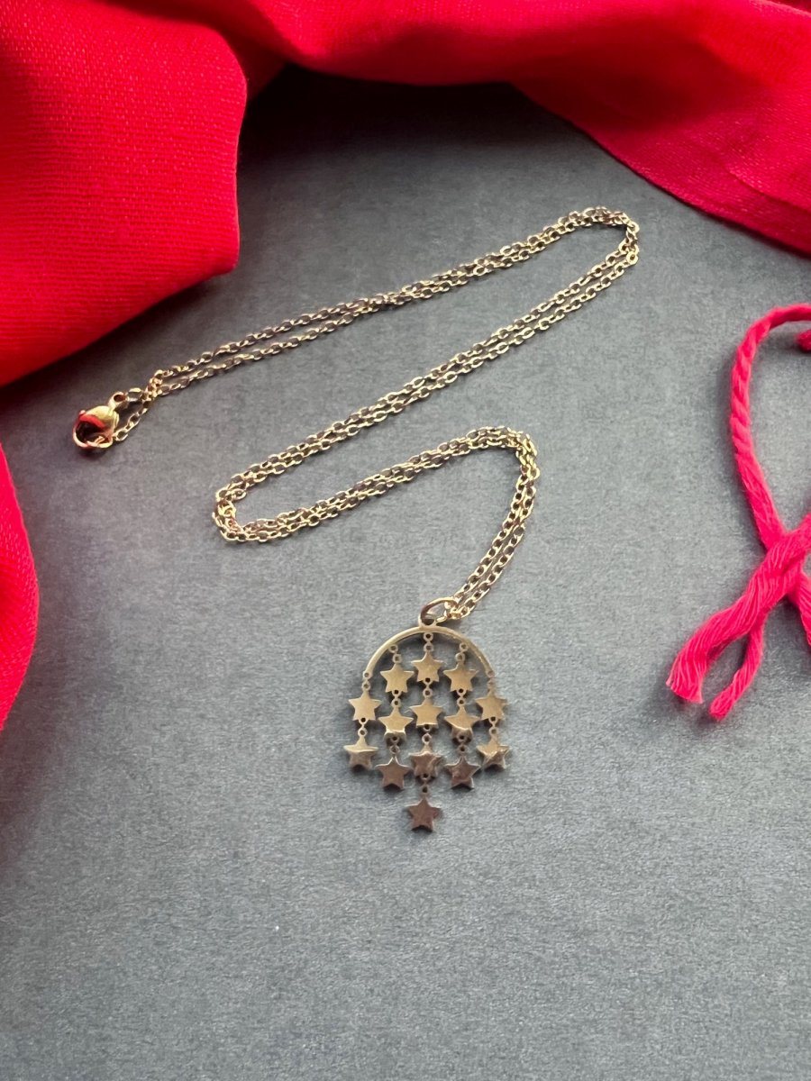 Jemný řetízek s přívěskem s hvězdičkami - cca 2,5 cm. Řetízek má délku 50 cm a na zapínání karabinku. Řetízek a veškeré kovové komponenty jsou z pozlacené nerez oceli - nemění barvu a je vhodný i pro alergiky