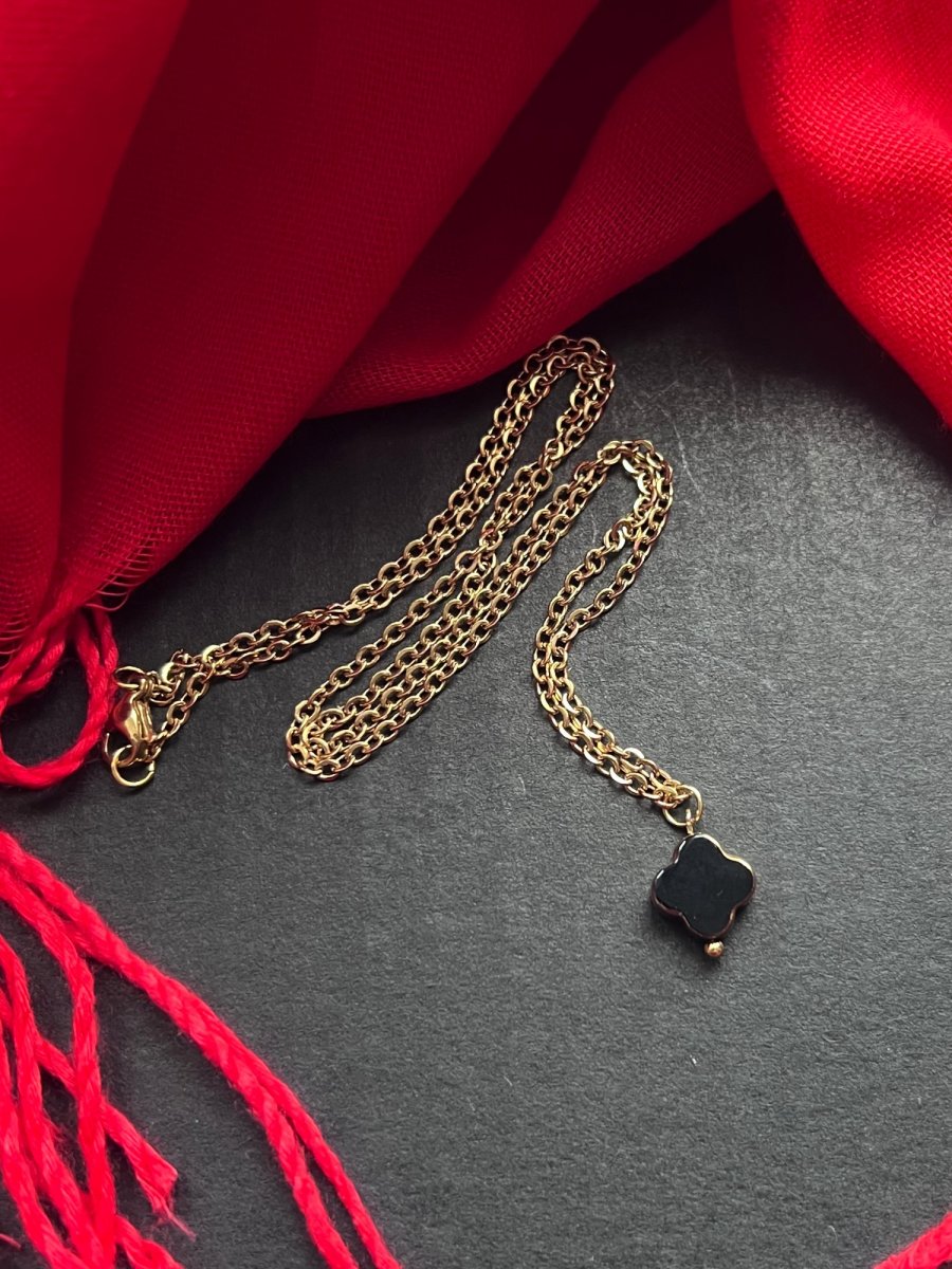 Jemný řetízek s drobným skleněným přívěskem - cca 1cm. Řetízek má délku 45 cm a na zapínání karabinku. Řetízek a veškeré kovové komponenty jsou z pozlacené nerez oceli - nemění barvu a je vhodný i pro alergiky