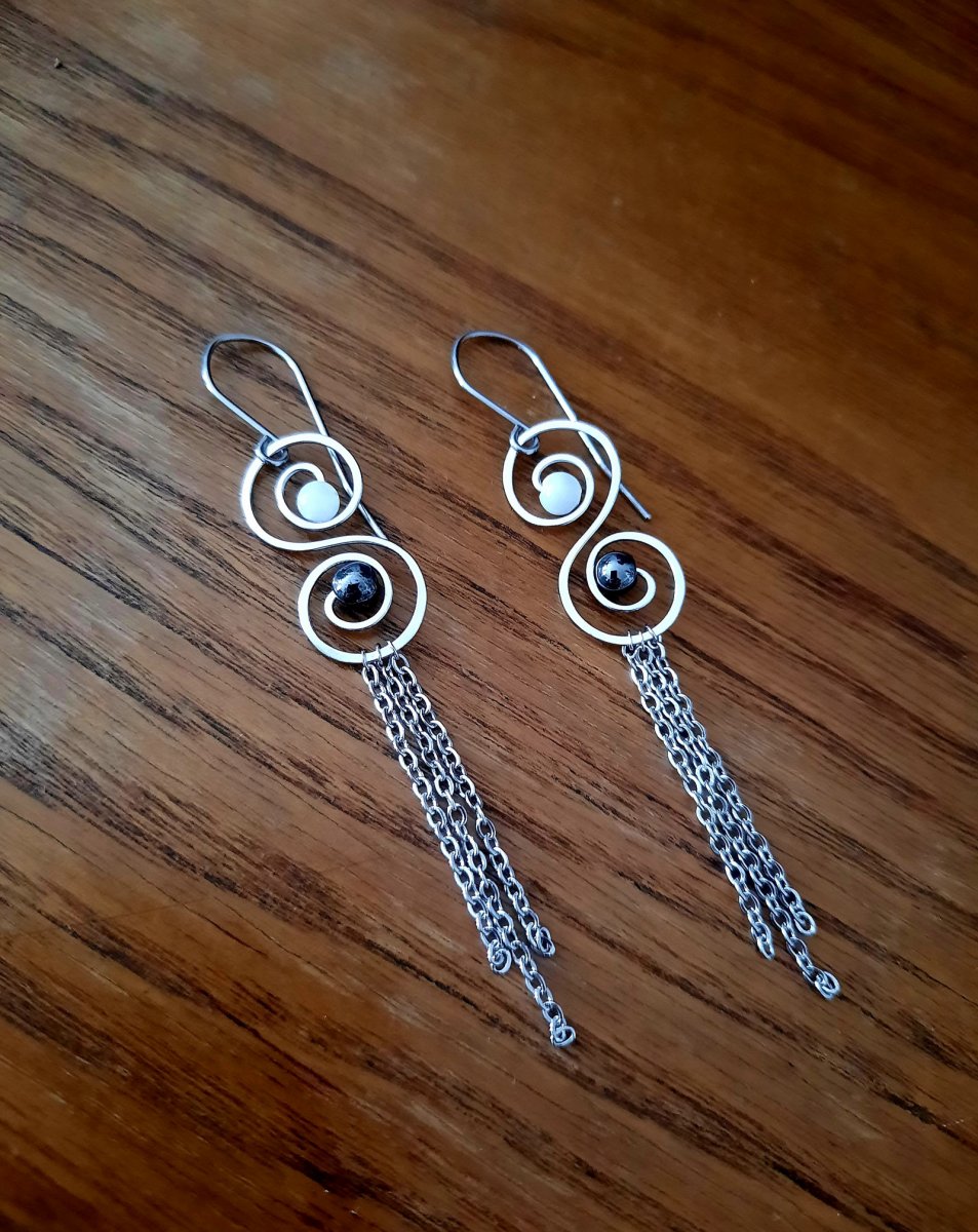 Řetízkové náušnice jsou ručně tepané z chirurgické oceli zavěšené na háčku z chirurgické oceli.
