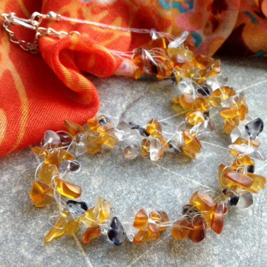 Náhrdelník - motanice - ze skleněných zlomků rezavé, čiré a šedé barvy na šesti silonových vlascích.