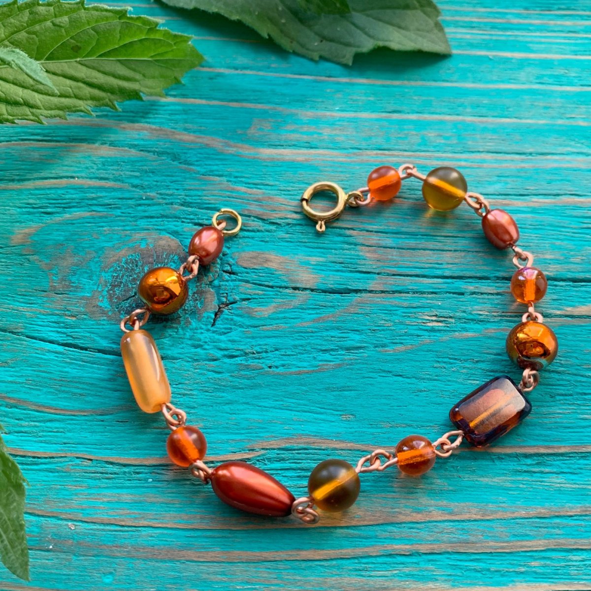 Ketlovaný náramek z voskovaných a skleněných korálků. Délka 19 cm, zapínání v barvě zlata, běžný kov, délku můžu na přání upravit