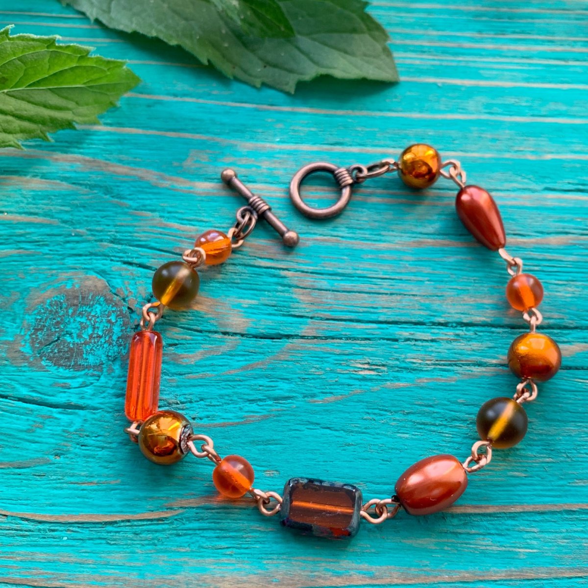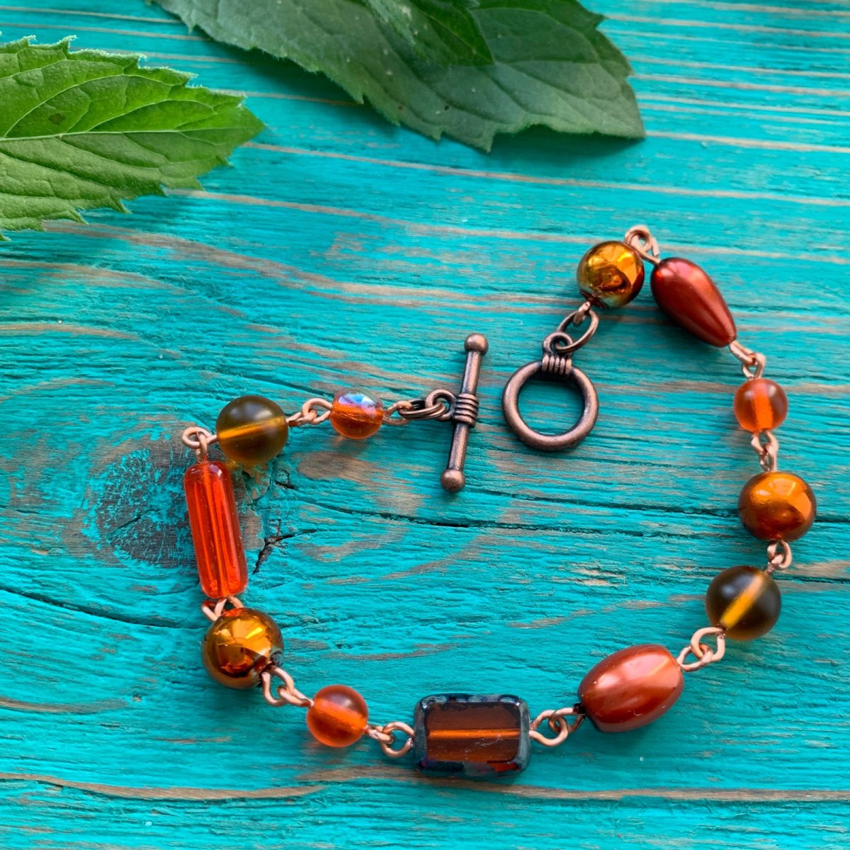 Ketlovaný náramek z voskovaných a skleněných korálků. Délka 19 cm, OT zapínání v barvě mědi, délku můžu na přání upravit