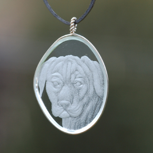 Ručně broušený a rytý přívěsek z tvrzeného skla s postříbřeným drátkem, rozměry 4x2,9 cm. Doplněno koženým závěsem, na přání lze dokoupit u nás i řetízek v barvě stříbra, ev. jiný závěs.