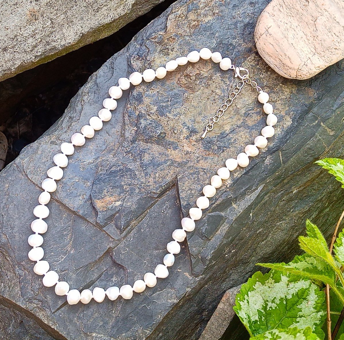 Bílé dokonale lesklé říční perličky o průměru cca 8 mm v něžném náhrdelníku se zapínáním na karabinku s prodlužovacím řetízkem s přívěskem kyvadla.
