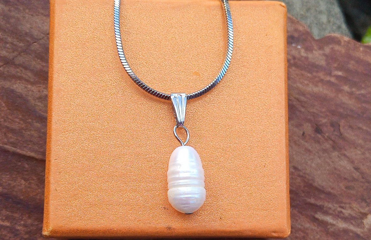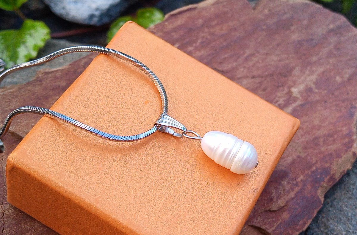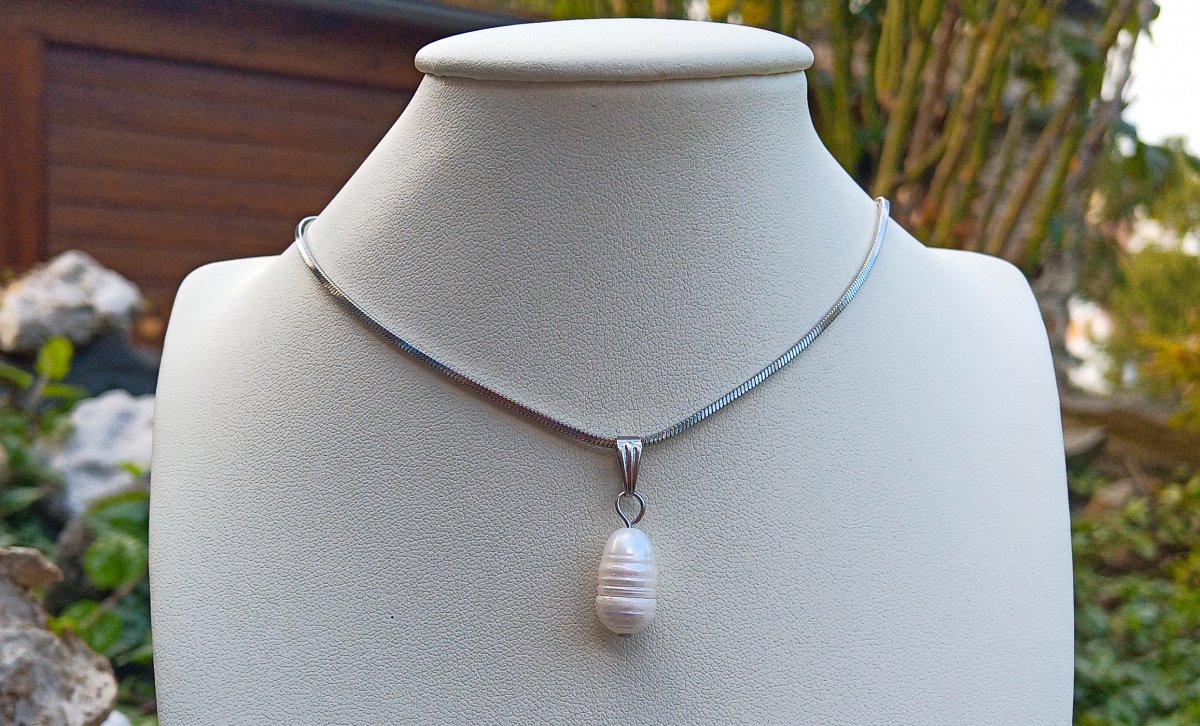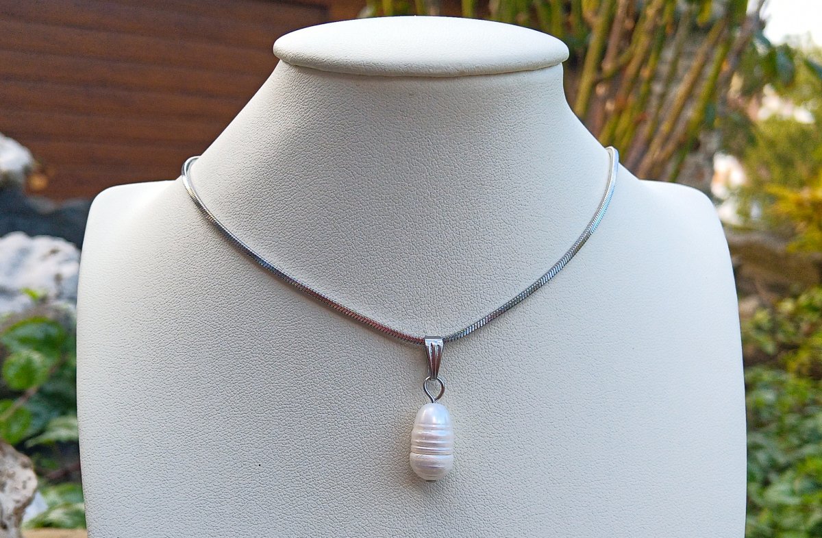 Bílá dokonale lesklá velká říční perla o velikosti 15 mm zavěšená na hadovitém řetízku z chirurgické oceli - hypoalergenní, vhodný i pro alergiky. Délka řetízku 40 cm. V případě zájmu mohu přidělat prodlužovací řetízek.