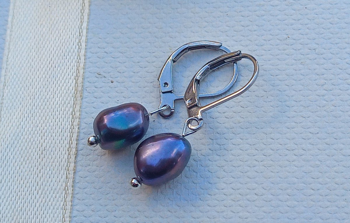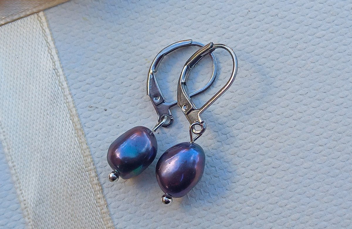 Dokonale lesklé tmavě modré až antracitové říční perly velké cca 10 mm s nádhernými duhovými perleťovými odlesky v elegantních náušnicích na zavíracích háčcích z chirurgické oceli - hypoalergenní, vhodné i pro alergiky.
