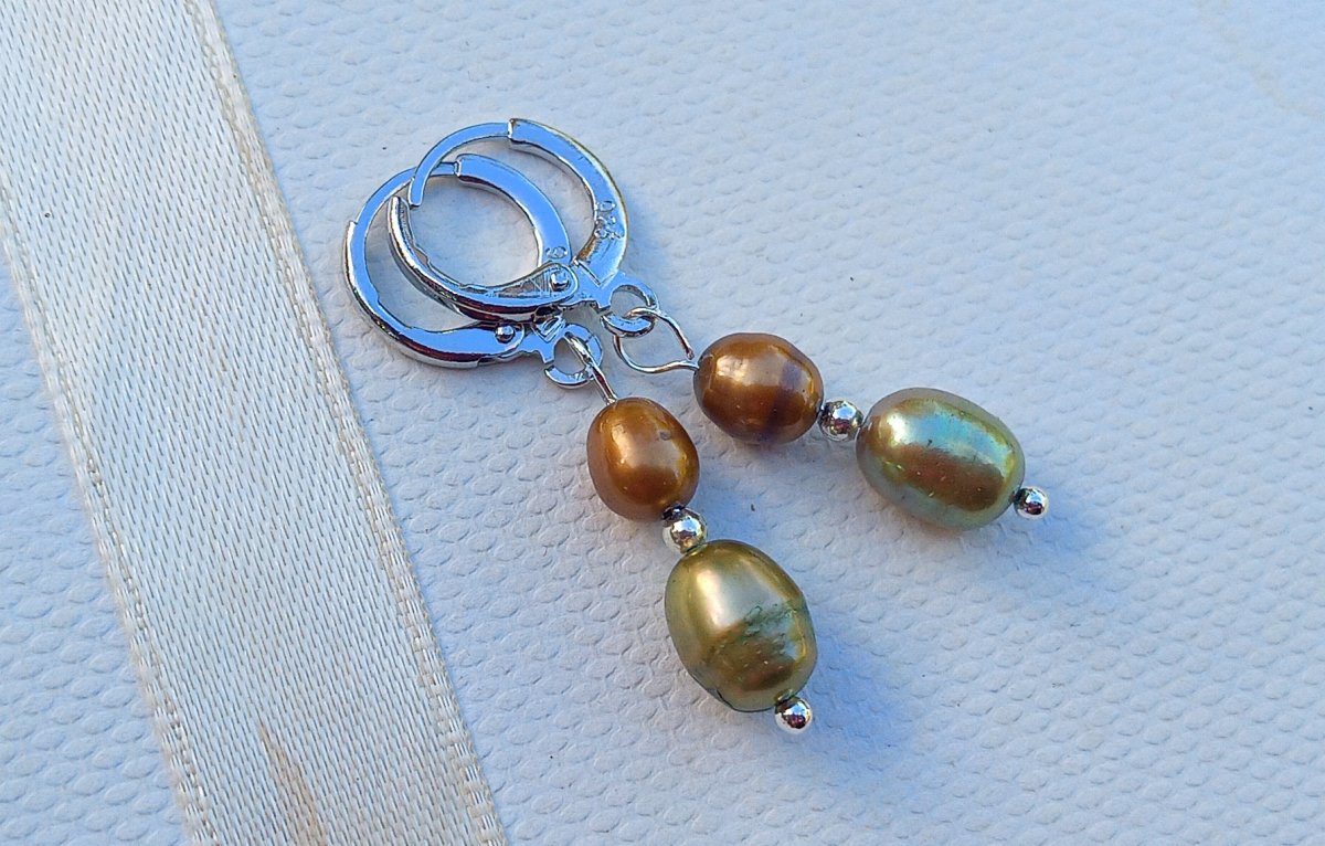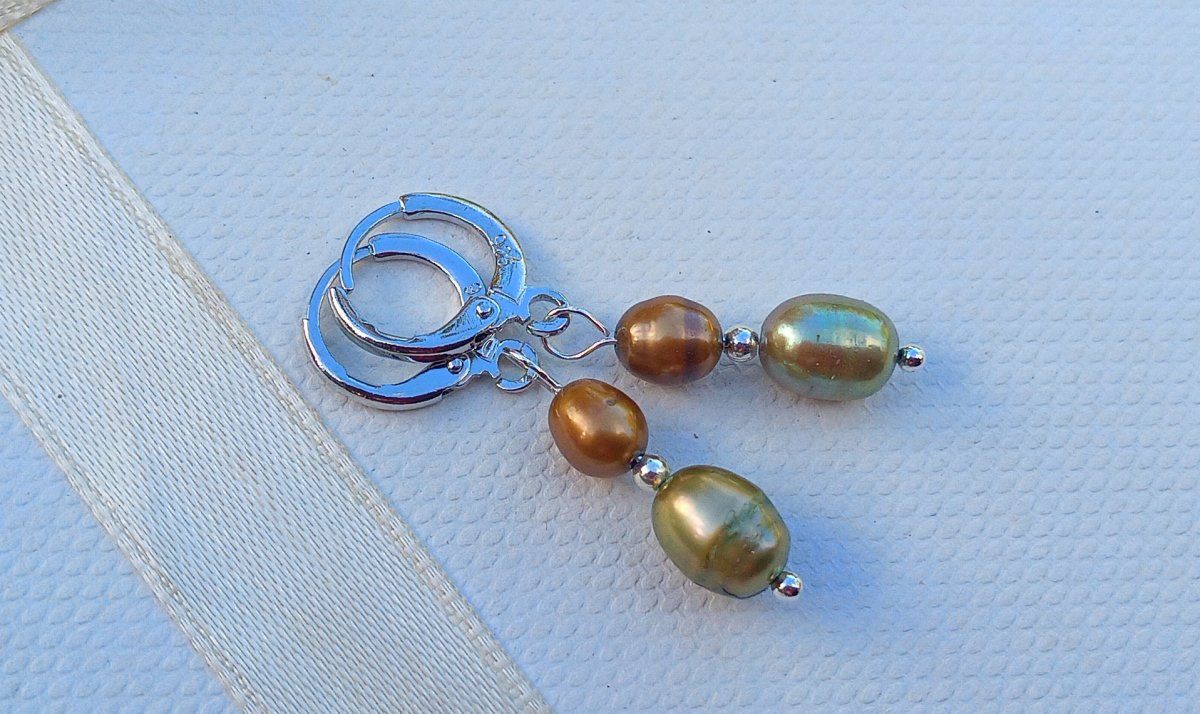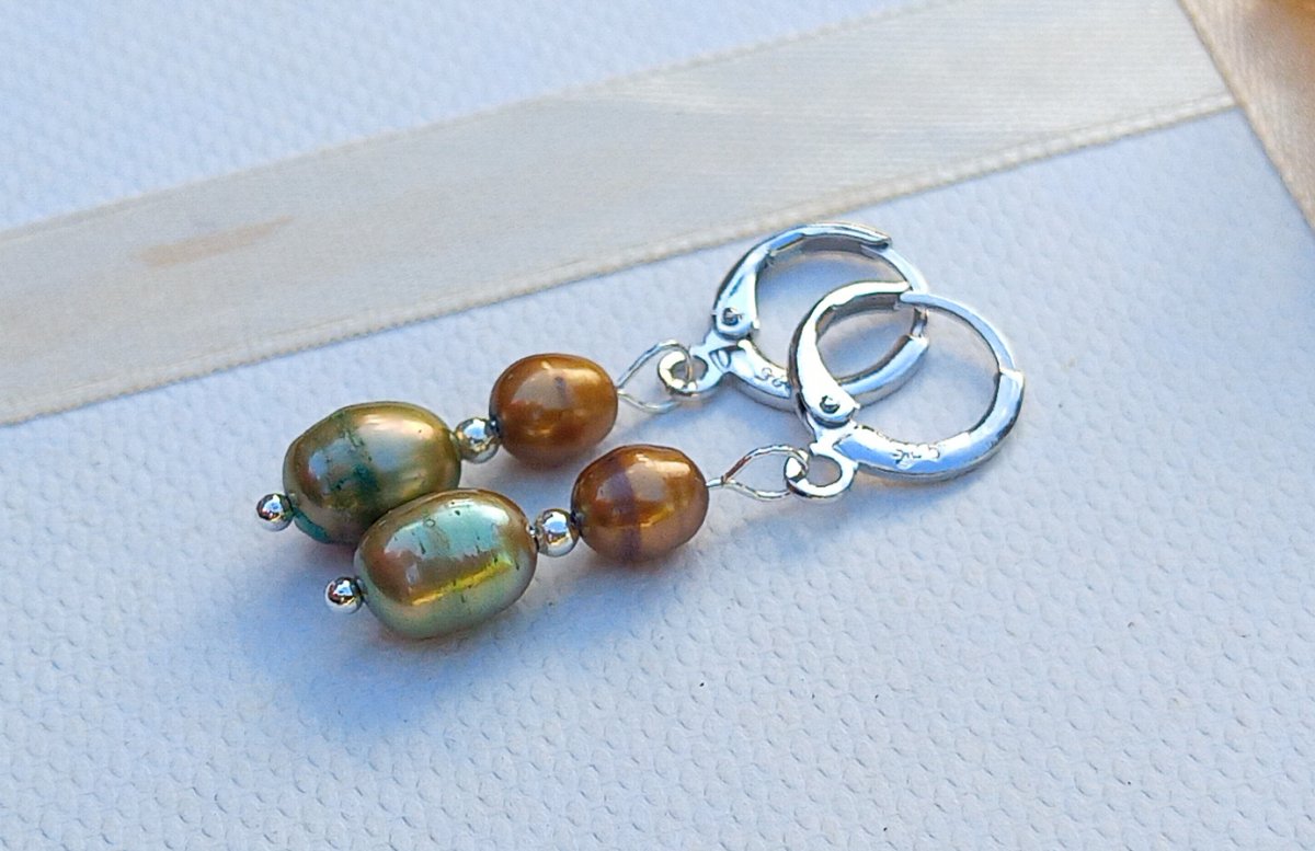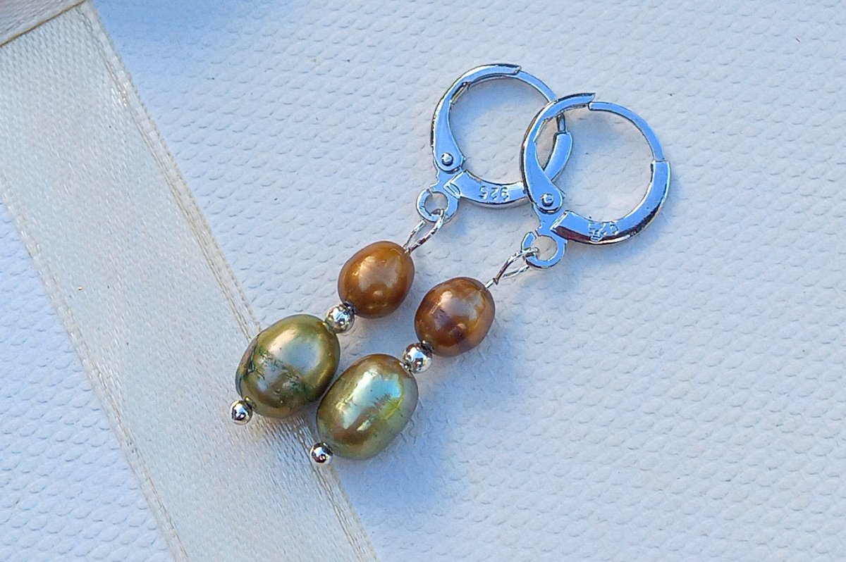 Náušnice z dokonale lesklých hnědých a zelených říčních perel o velikosti cca 9 a 6 mm na postříbřených zavíracích háčcích.