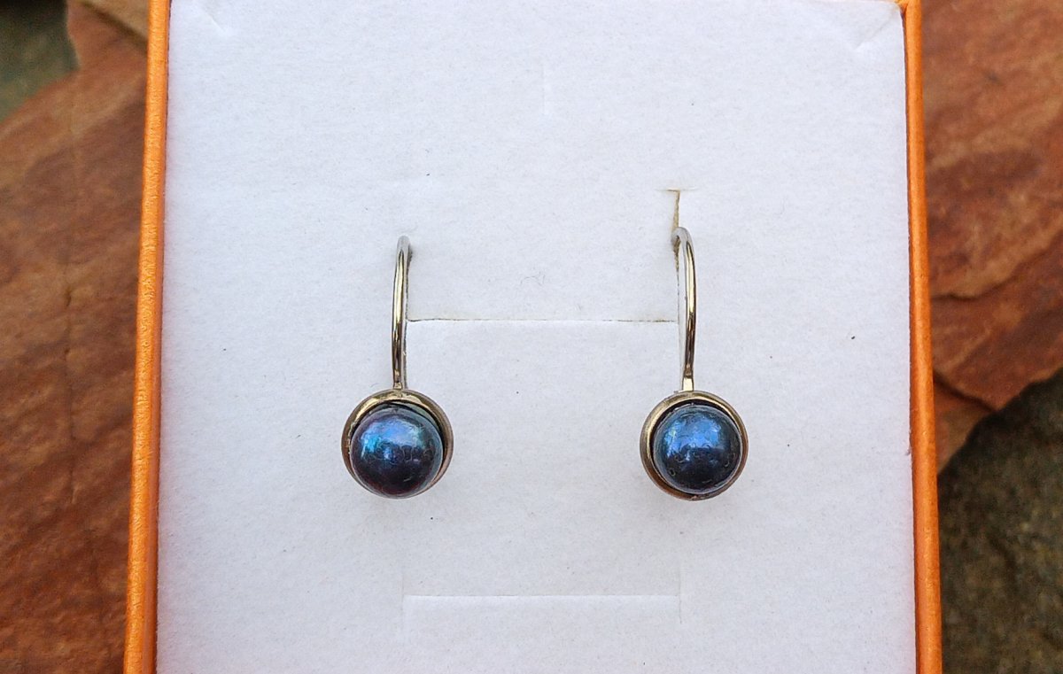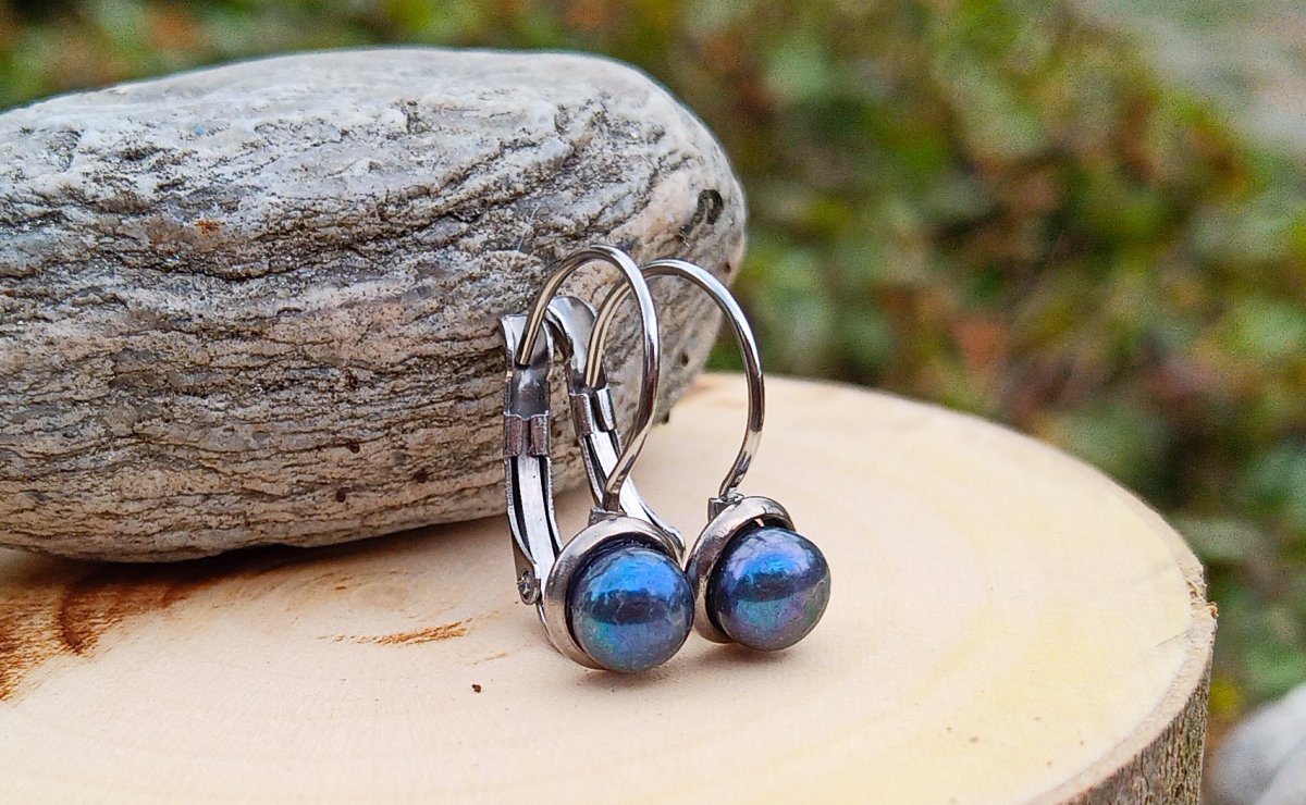 Elegantní náušnice s dokonale lesklými říčními tmavě modrými perlami o průměru 6 mm s krásnými duhovými perleťovými odlesky vloženými do zavíracích háčků z leštěné chirurgické oceli - hypoalergenní, vhodné i pro alergiky. Perly jsou v top kvalitě!