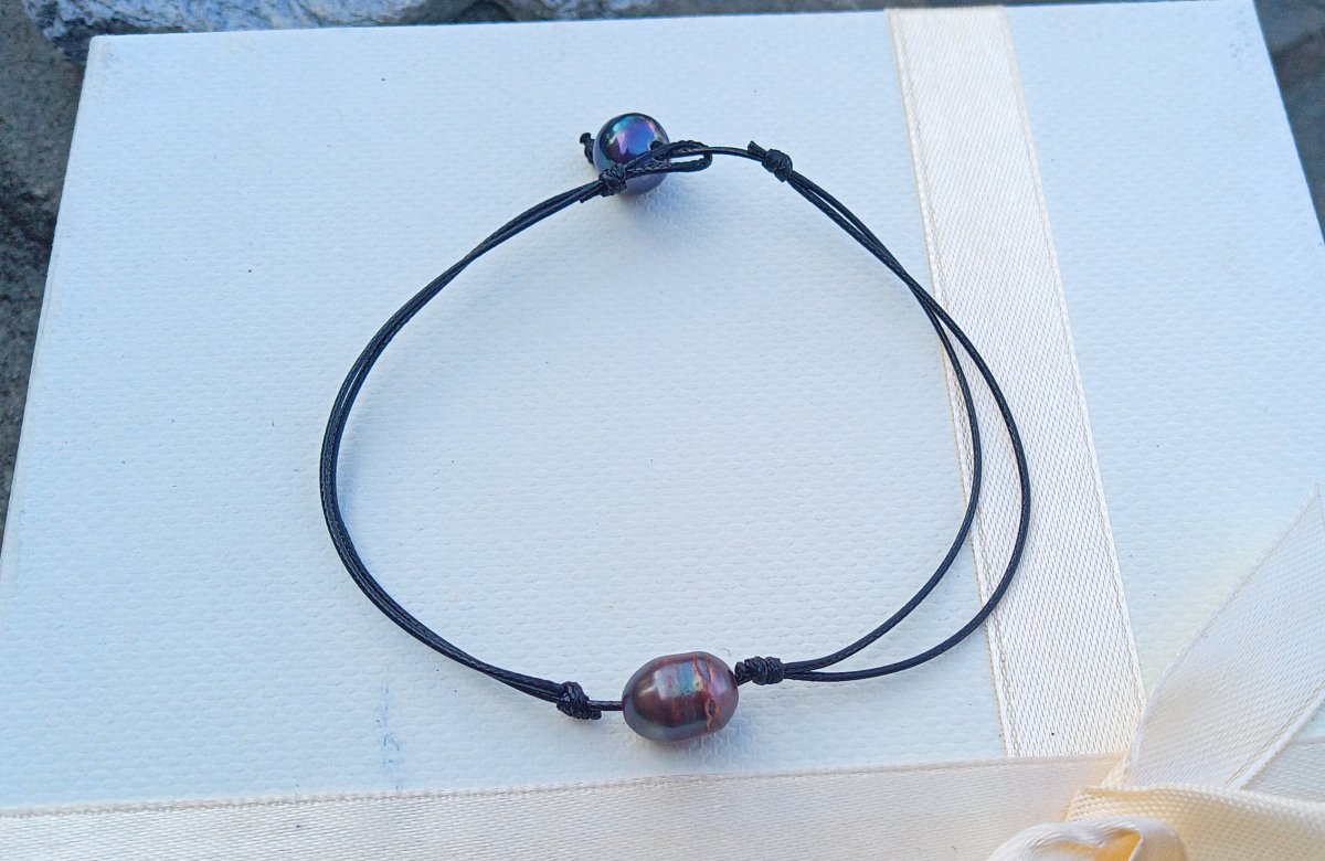 Hnědá a antracitová dokonale leská říční perla o velikosti 10 a 8 mm na černé voskované šňůrce s posuvnými uzlíky, díky nimž si nastavíte délku dle potřeby. Náramek se zapíná přes perličku. Možno nosit i na kotníku.