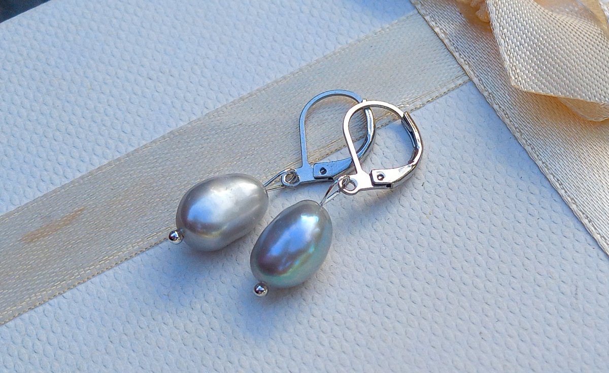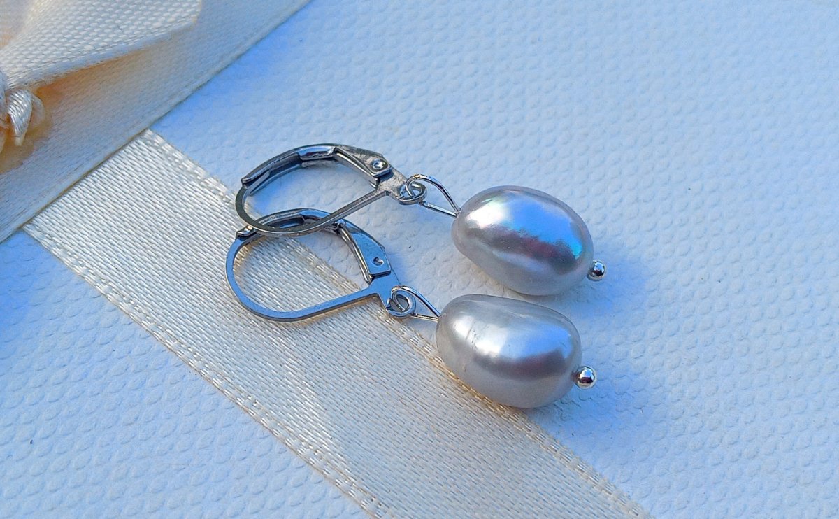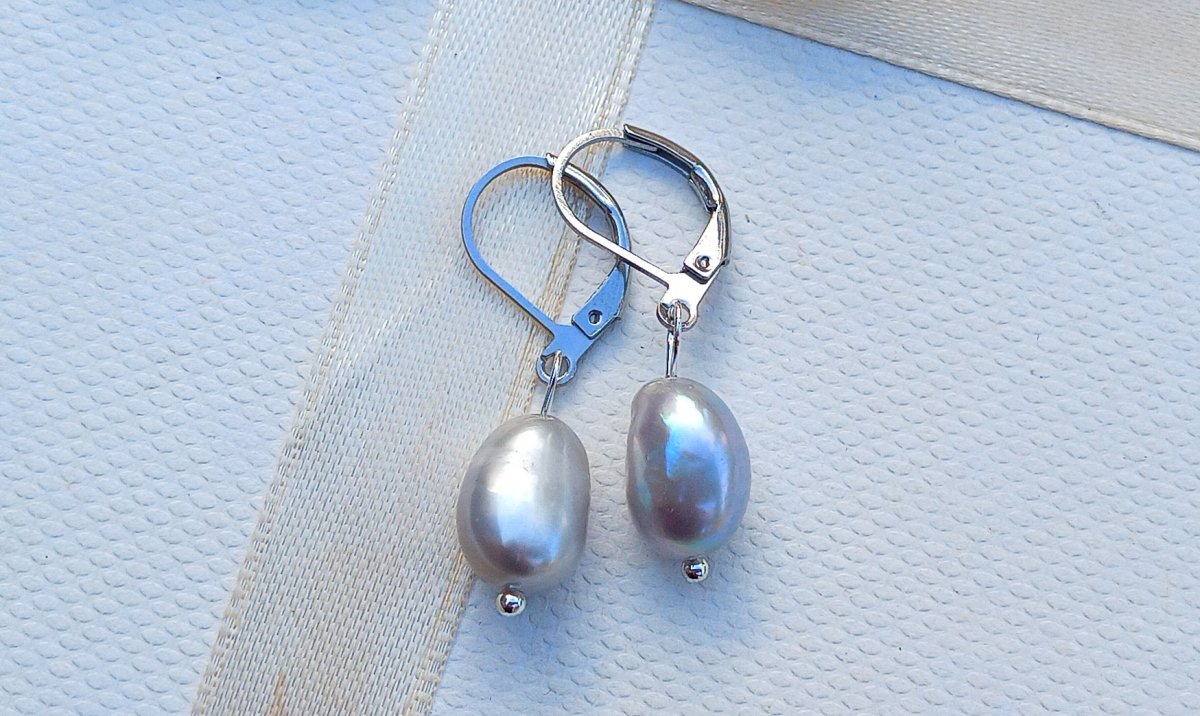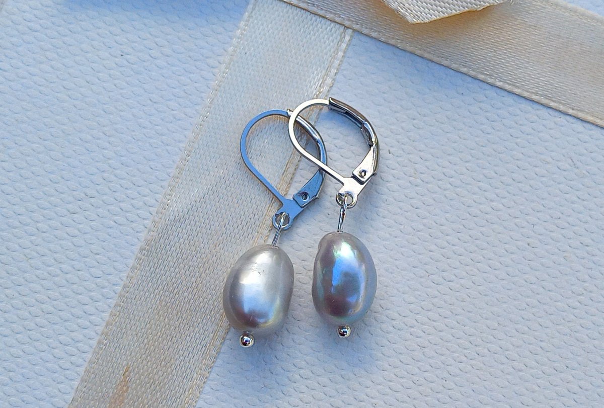 Dokonale lesklé šedé říční perly velké cca 12 mm v elegantních náušnicích dlouhých 3,4 cm na zavíracích háčcích z chirurgické oceli - hypoalergenní, vhodné i pro alergiky.