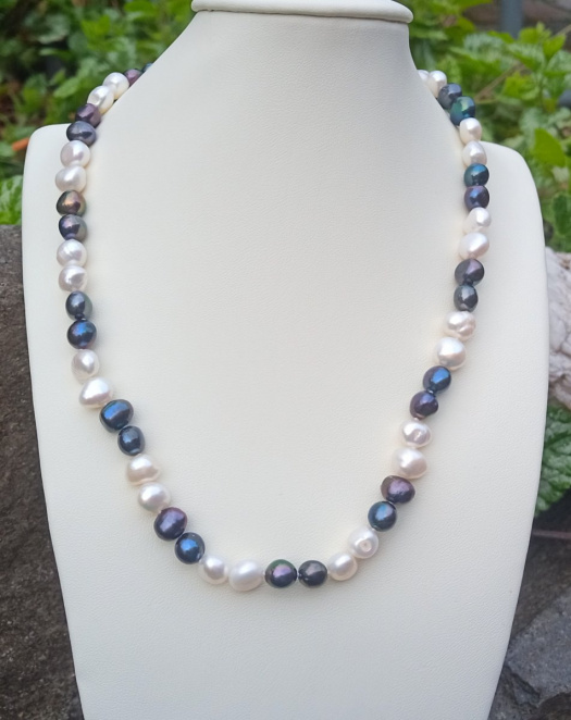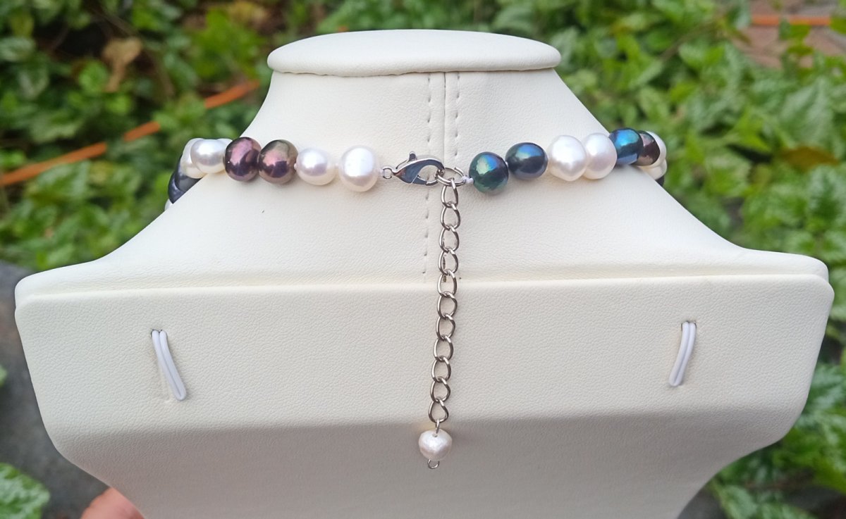 Bílé a tmavé dokonale lesklé říční perličky o průměru cca 8-10 mm v něžném náhrdelníku se zapínáním na karabinku s prodlužovacím řetízkem zdobeným bílou perličkou.