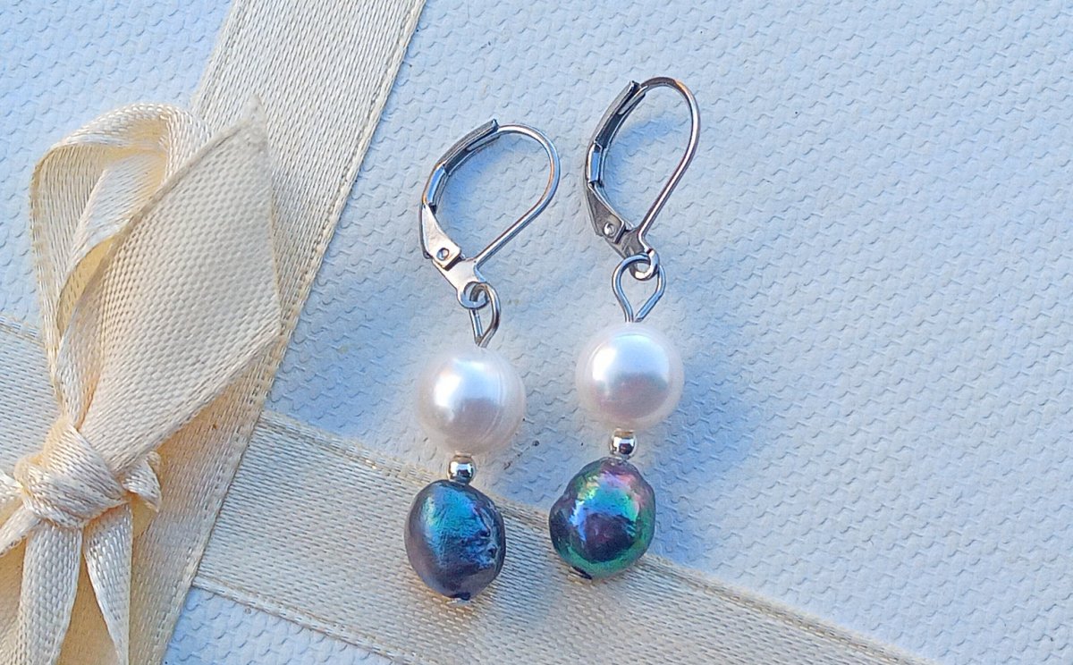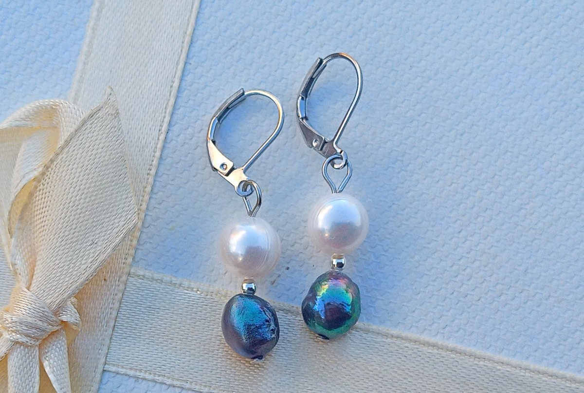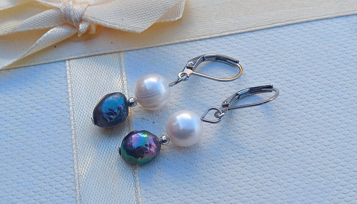 Náušnice z dokonale lesklých říčních perel o velikosti cca 10 a 8 mm v bílé a tmavě modré barvě oddělených od sebe drobným stříbrným korálkem na zavíracích háčcích z chirurgické oceli - hypoalergenní, vhodné i pro alergiky.