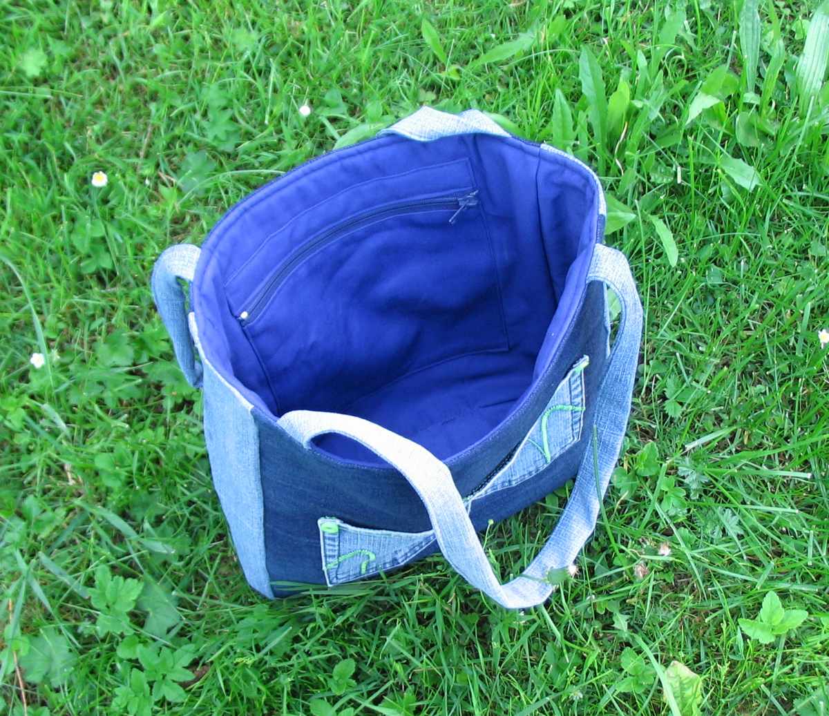 Originální taška ušitá z recyklované rifloviny, vytvořená kombinací několika druhů džínoviny – každá je tak jedinečná.