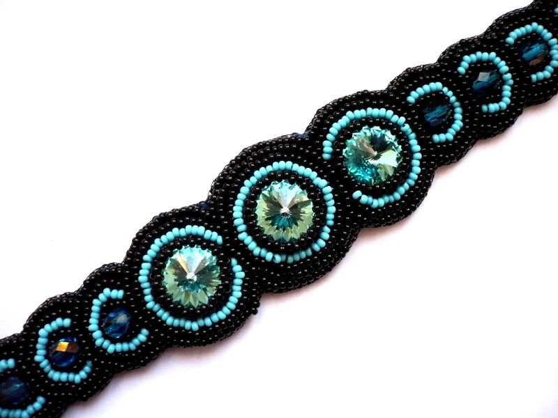 Ručně šitý náramek z rokajlových korálků černé a modré barvy. Náramek je vytvořen technikou beadweaving. Uprostřed šperku jsou tři modré rivolky Swarovski, obšité rokajlem a vše je podloženo plstí. Délka náramku na ručku max. 19,5 cm, šířka 3,5 cm v nejširším místě. Zapínání je na karabinku z chirurgické oceli, náramek je tedy hypoalergenní.