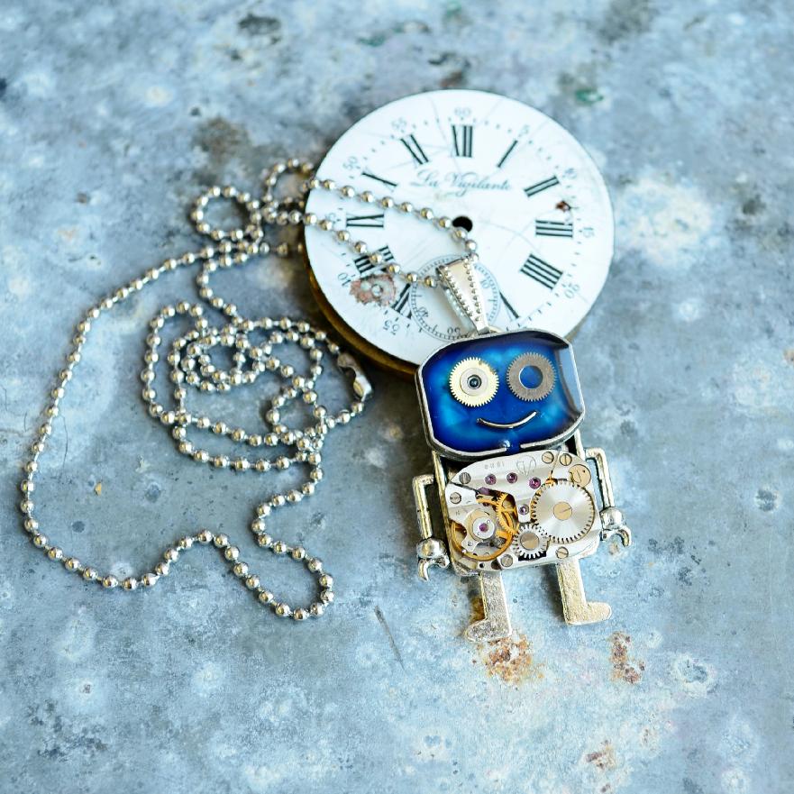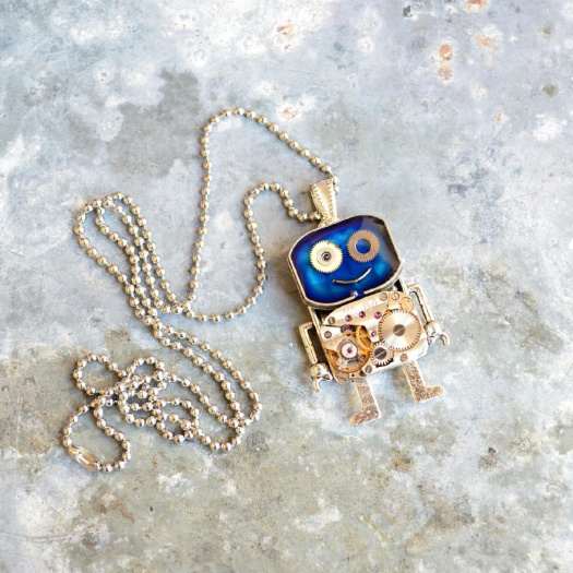 ROBOT - originální steampunkový přívěsek.Na zadní části přívěsku je reliéf robota.Velikost robota je 3,5 x 2,5 cm.Řetítek v barvě platiny o délce 62cmDárkově baleno.