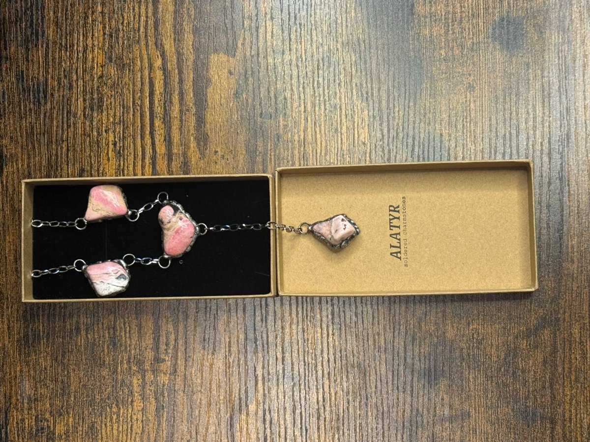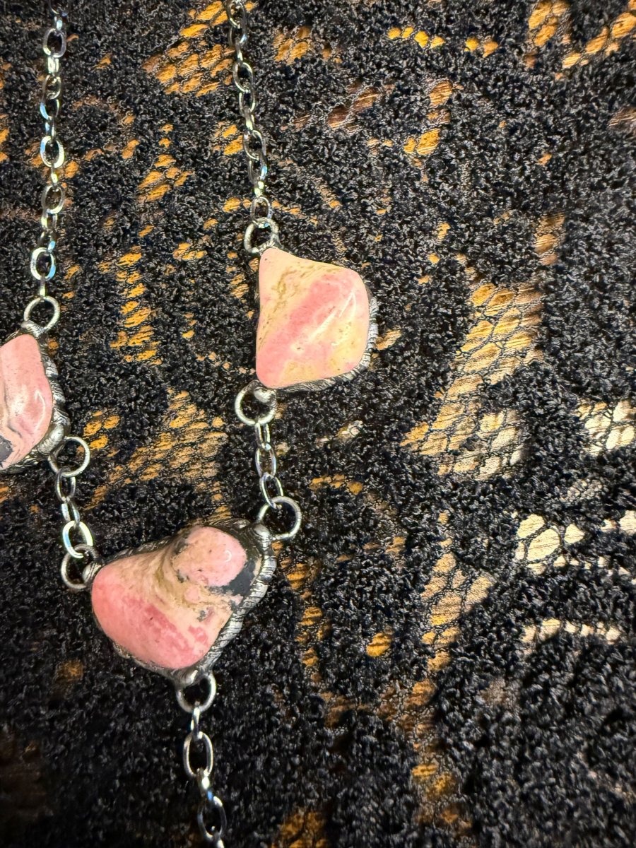 Dlouhý náhrdelník se čtyřmi kameny rodonitu.