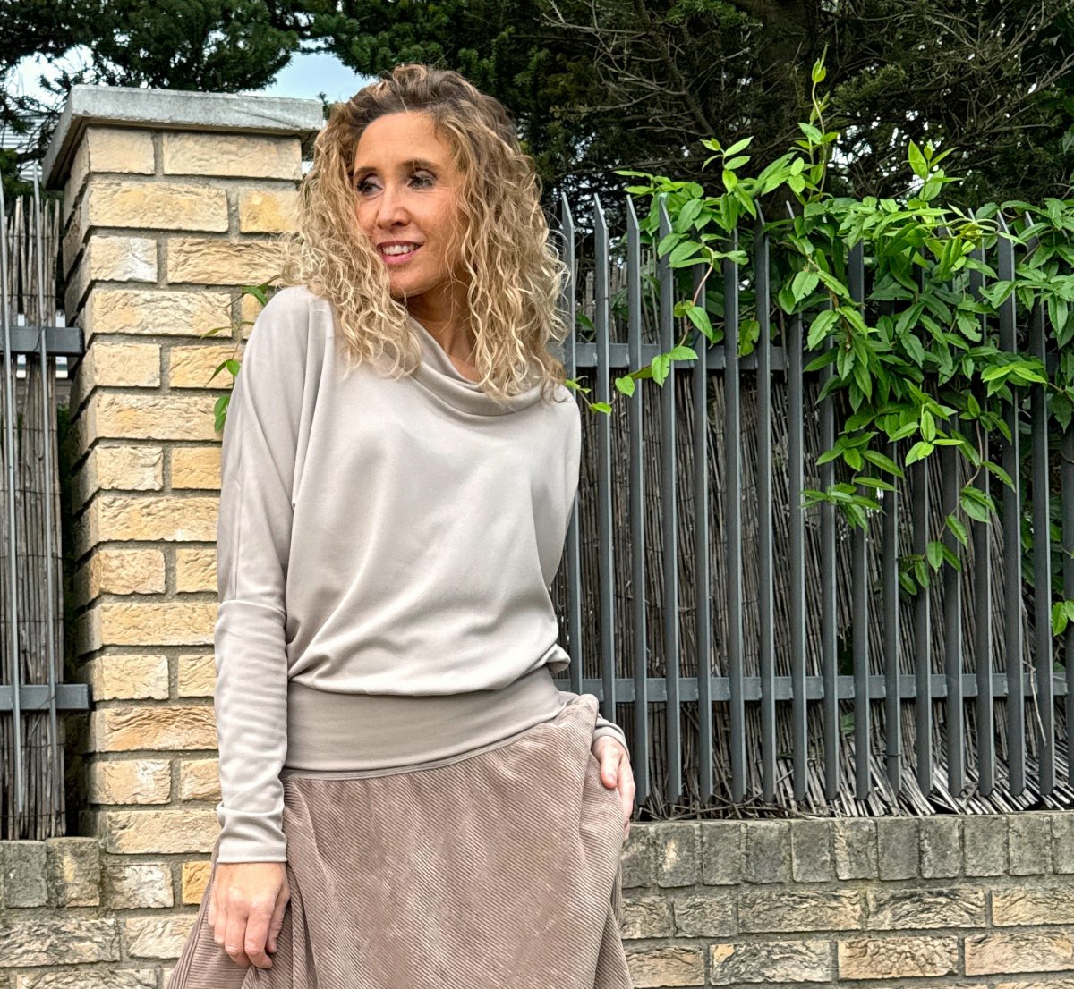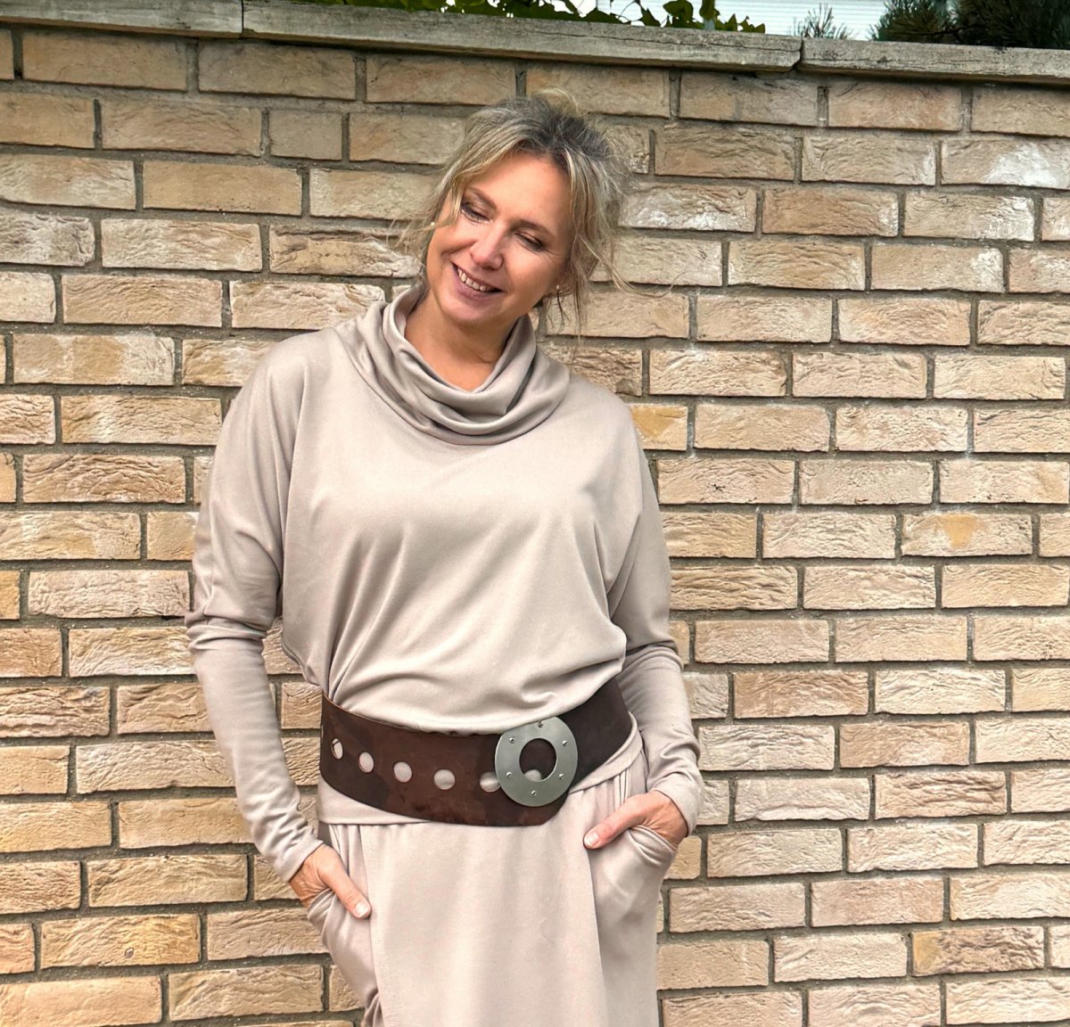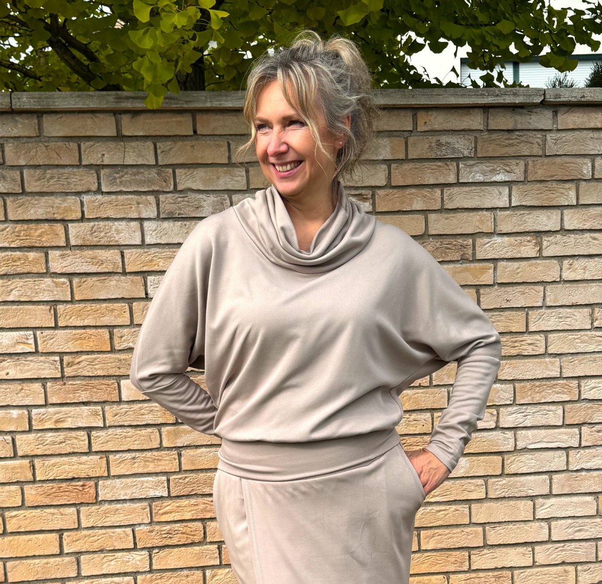 Rolák s dlouhým netopýřím rukávem je ušitý ze středně silného směsového úpletu (68%vis/28%Pes/4%ela). Spodní díl je stažený do širokého pružného lemu.