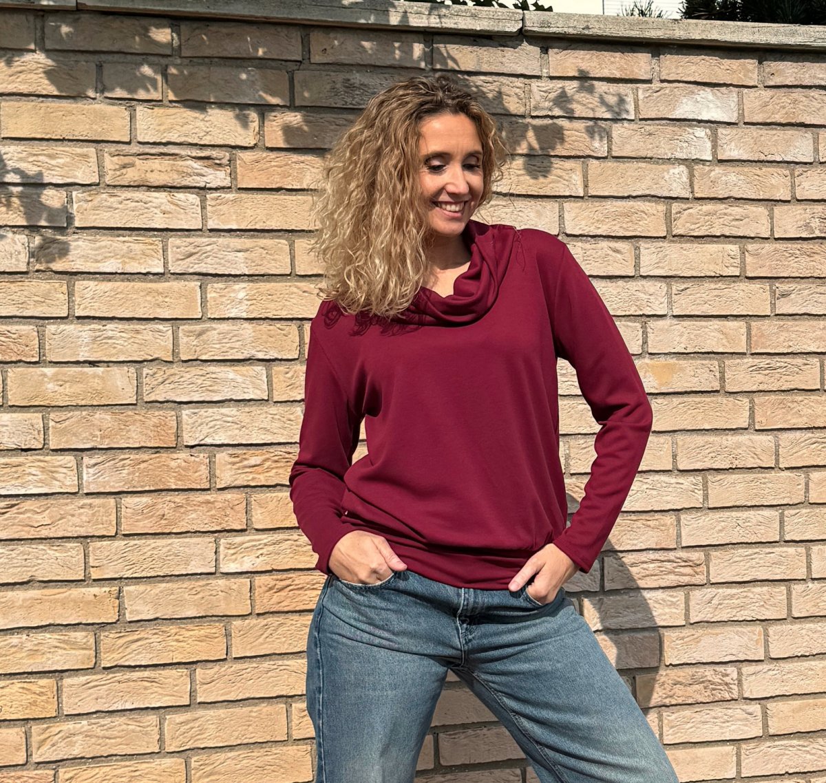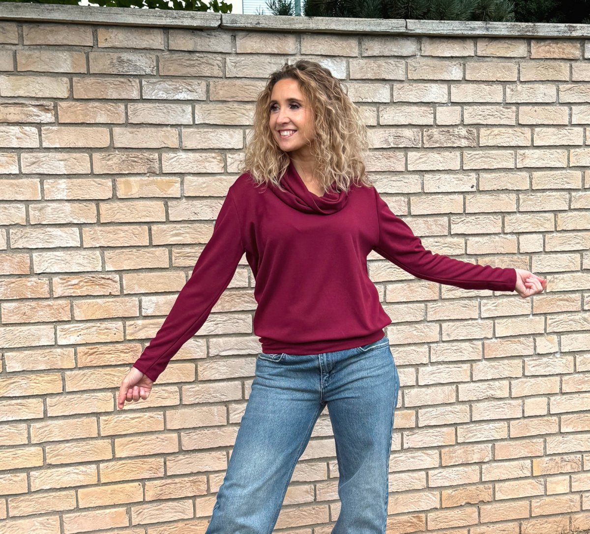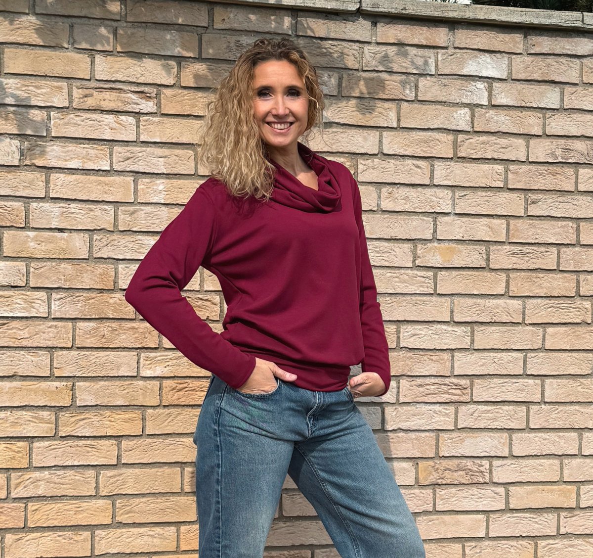 Rolák s dlouhým rukávem je ušitý ze středně silného směsového úpletu (68%vis/28%Pes/4%ela). Spodní díl je stažený do širokého pružného pasu.